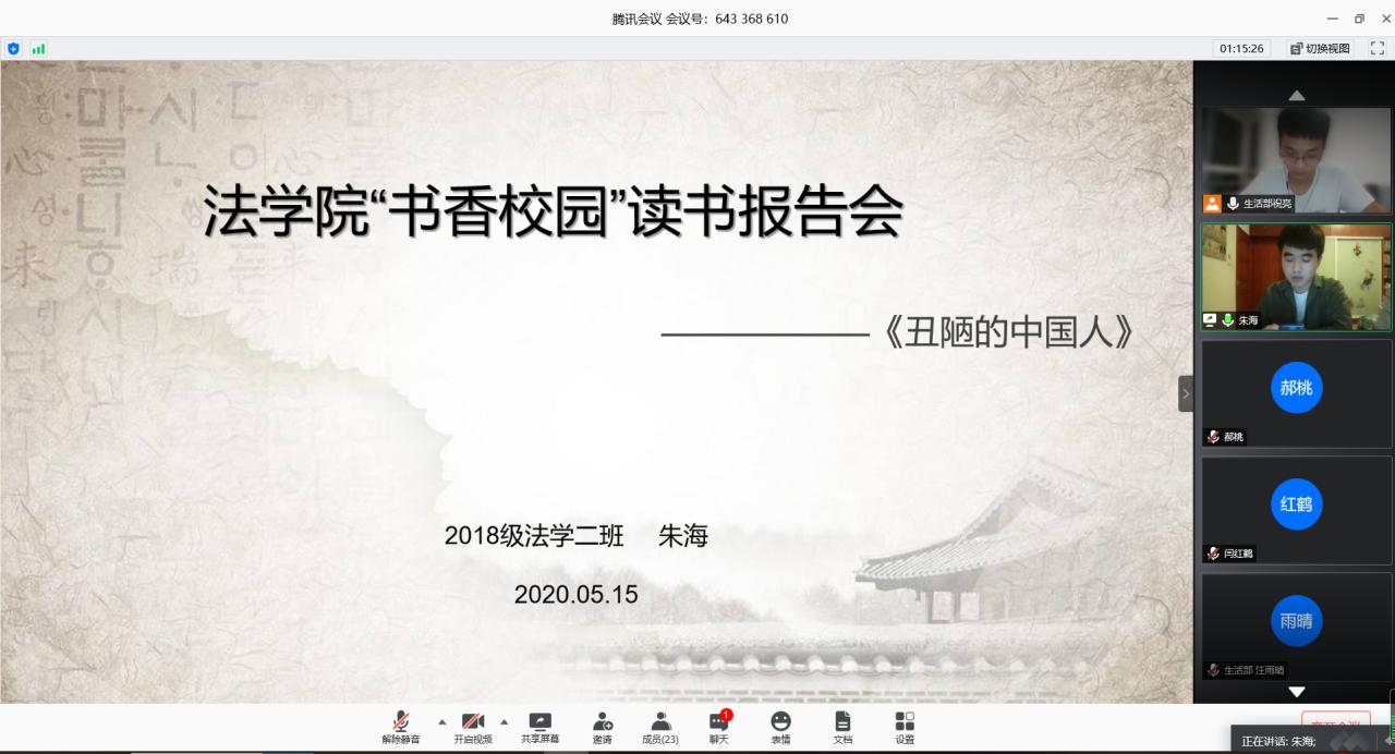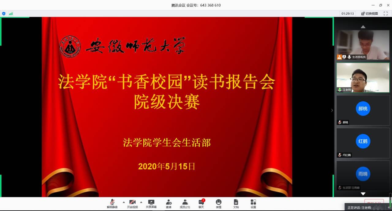 5月15日晚上,英国上市公司365借助腾讯会议平台举办“书香校园”读书报告会院级决赛。法学专业汪小棠老师、行政管理专业王焕炎老师、2018级法学一班、行政管理班辅导员冯晟老师、2018级法学二班辅导员劳祖迪老师作为评委莅临指导。本次比赛由生活部委员祝亮主持。