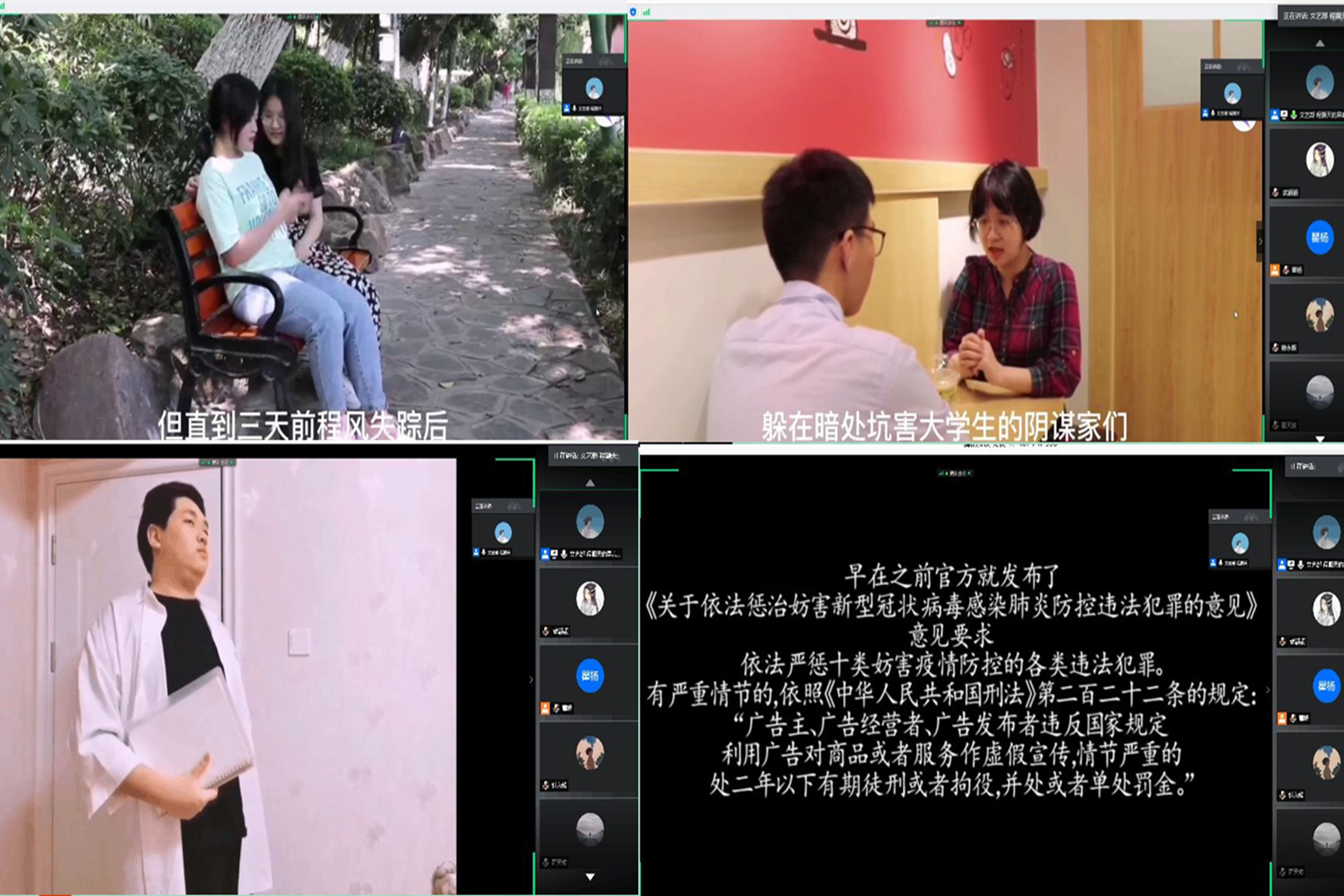 本次比赛由主持人共享屏幕共同观看七个作品,每部电影放映结束后由电影负责人进行立意讲解。解释放映后评委进群打分。七个作品立意新颖,形式多样。《失落》描述一个女老员工借贷受骗,揭露校园贷、网贷的套路,引人深思;《迷藏》围绕借债和老员工情感展开,情节起伏;《幕后推手》以新冠疫情为背景展开,披露无良商家欺骗消费者的违法行径;《虚“章”生事》借刻画一个为求职而造假证书的毕业生,告诫同学们不可学术造假;《消失的恋人》描述以“男朋友”身份骗钱的PUA行为;《泥潭》教会同学面对不断骚扰,要勇敢拿起法律武器保护自己;《生活大爆炸》以卡通配音展开,提醒老员工警惕诈骗。