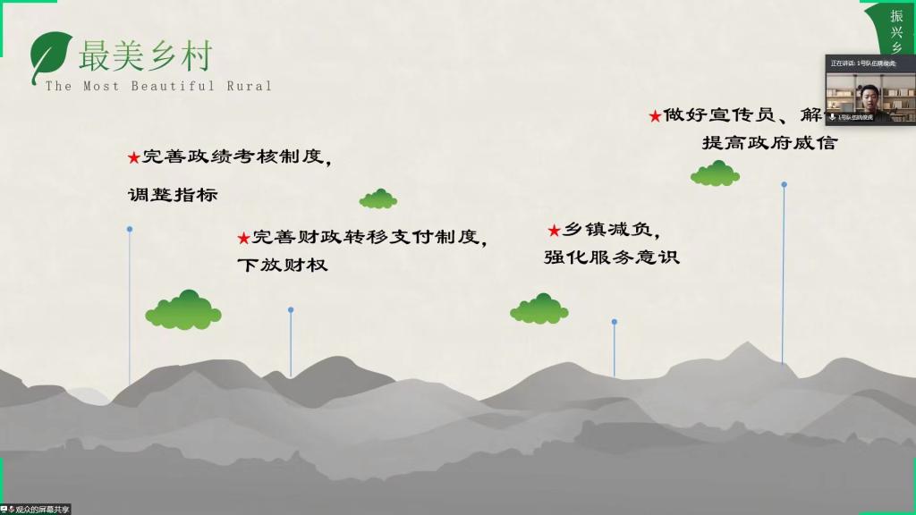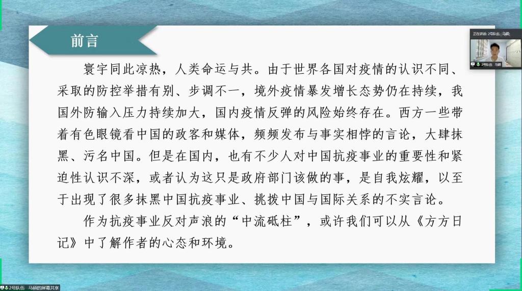 选手可以选择通过放映演示文稿、现场表演故事情节、播放自制微视频和现场旁白解读或是其他与线上比赛条件相匹配的形式进行汇报。参赛选手充分结合社会热点问题,在精彩的故事中融入法律知识,声情并茂地讲演汇报,言语中传递着自己的思考和感悟,引起了在场人员对时政的关注与深思。每组同学的表现都各具特色,尽显自信沉稳、落落大方的风范。