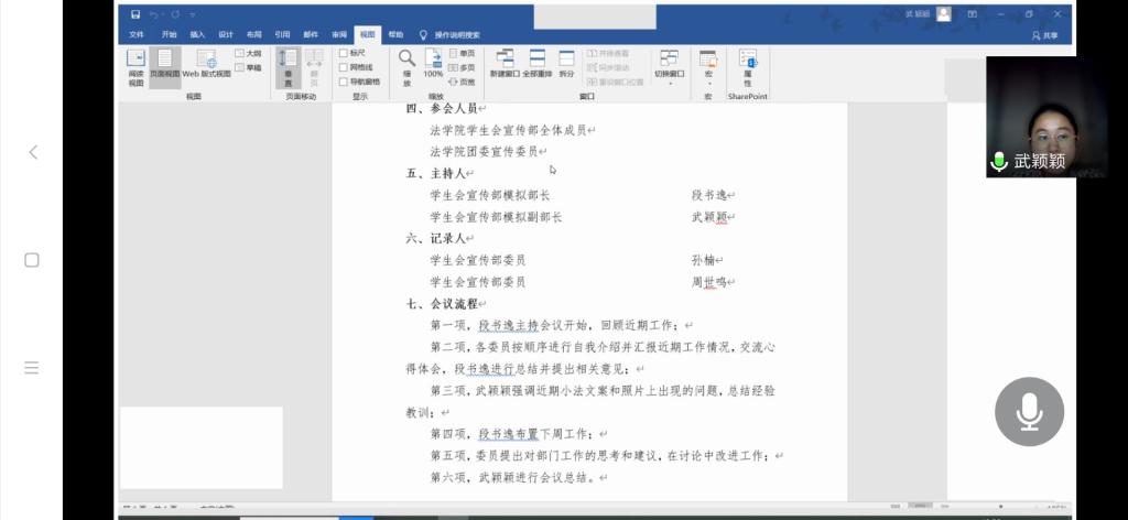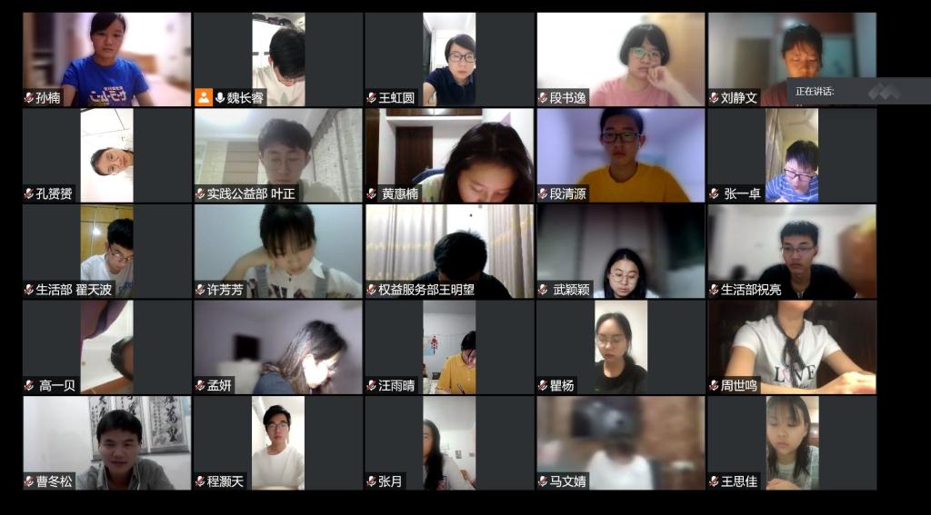 实践课程安排主要包括旁听例会和模拟例会,“律政菁英”班学员通过腾讯会议平台分组参与旁听和考核。在旁听例会中,学员们亲身观摩、学习各部门例会,总结相关注意事项,为以后独立召开例会积累经验。在模拟例会中,学员们需要提前设计会议议程,扮演模拟部长或模拟副部长主持会议,这既是对他们协作配合能力的考查也是对临场应变能力的考验。模拟例会会后,评审们对学员表现作出肯定的同时,也提出了有针对性的问题和切实可行的建议。最后,评审团成员将综合学员们的会议表现和会议记录参考打分。