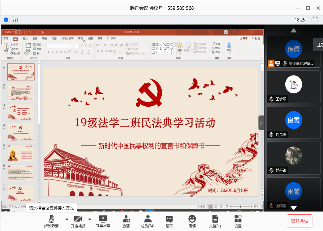 (本网讯 文/摄 王梦羽)《中华人民共和国民法典》被称为“社会生活的百科全书”,是新中国第一部以法典命名的法律,在法律体系中居于基础性地位,也是市场经济的基本法。为广泛开展民法典普法,切实推动民法典实施, 2020年6月10日,19级法学二班借助腾讯会议APP组织开展民法典学习宣传活动,提高同学们的法治观念,引导同学们养成自觉守法、解决问题靠法的意识和能力,营造和谐稳定的社会环境和良好的法治环境。