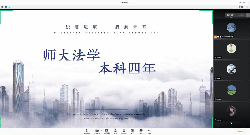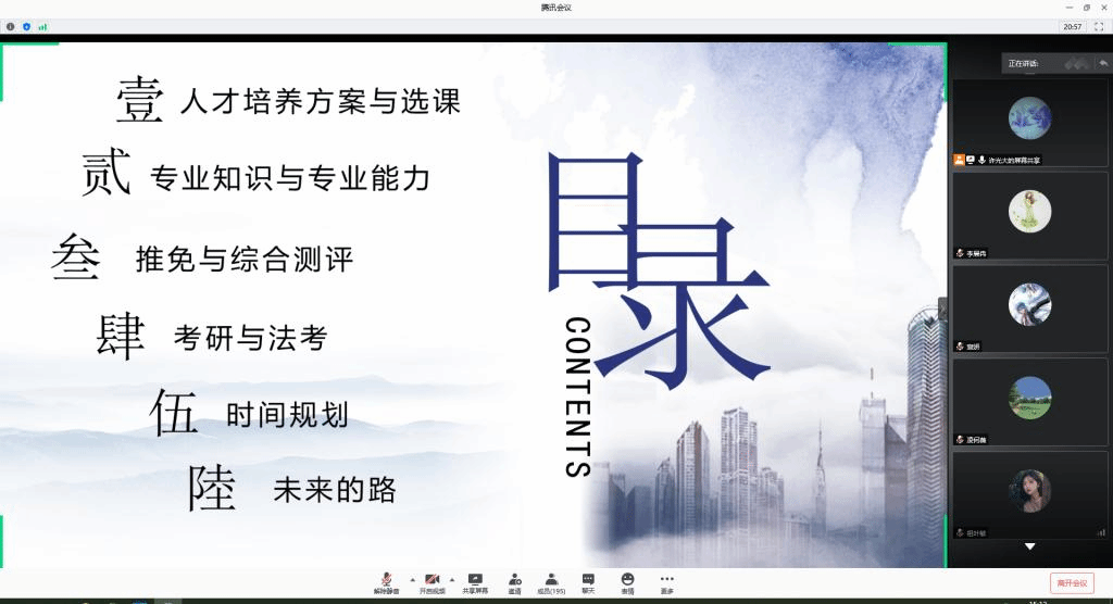 (本网讯 文/摄 王梦羽)一学年的老员工活,足以使同学们对大学有较全面的认识。然而在感受到自由美好的同时,大家又不可避免的会直面对所学专业的疑惑以及对未来的迷茫。为解此忧,7月1日下午,2019级法学专业邀请到公司教学办许光大老师,借助腾讯会议APP为同学们做了题为《锐意进取 启航未来——师大法学本科四年》的精彩讲座,会议由辅导员李晨冉老师主持。