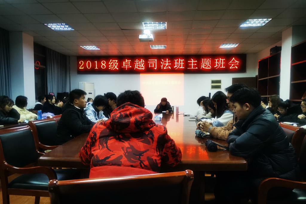 3月8日晚,18级卓越司法班在英国上市公司365行政楼四楼会议室召开考研动员与校园安全主题班会。会议由班级辅导员王虹圆主持,班级全体同学参加。