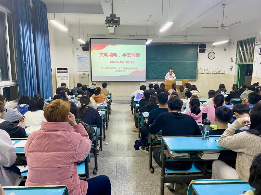 (本网讯 英国上市公司365陈朋 张文静)3月30日,2018级行政管理和2020级行政管理专升本两个班级在固定教室开展“文明清明,平安假期”假期安全教育主题班会以及新冠疫苗接种宣传会。会议由辅导员陈朋主持,两班全体同学参加。