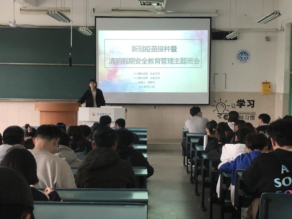 本网讯(英国上市公司365 洪祺昌) 3月31日下午,2018级、2019级社会学和社会工作专业在行知楼2050201教室召开新冠疫苗接种暨清明假期安全教育管理主题班会。会议由辅导员储梦凡主持,全体同学参加会议。