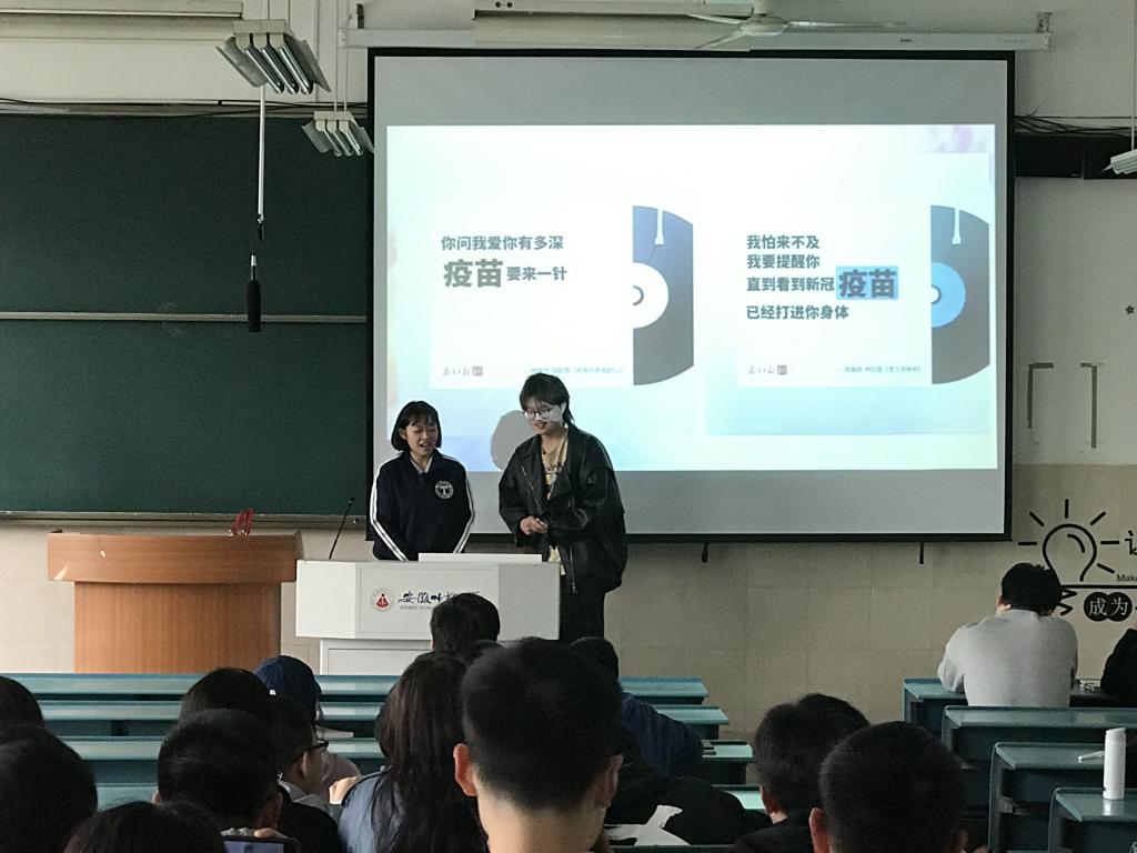 储梦凡用PPT展示了几句改编后反映新冠疫苗接种内容的流行歌词,由班级宣传委员刘艺明、焦嘉靖领唱。“突然好想你/你会在哪里/没打疫苗少出去”等脍炙人口的歌曲唱出来,形象生动地让同学们了解到接种新冠疫苗、建立全民免疫的重要性和必要性。储梦凡从客观形势、新冠肺炎特点、老员工群体特点等展开,鼓励同学们接种新冠疫苗。会上,储梦凡指出接种新冠疫苗的注意事项,解读不宜接种疫苗的人群的界定,介绍公司关于接种新冠疫苗的具体安排。