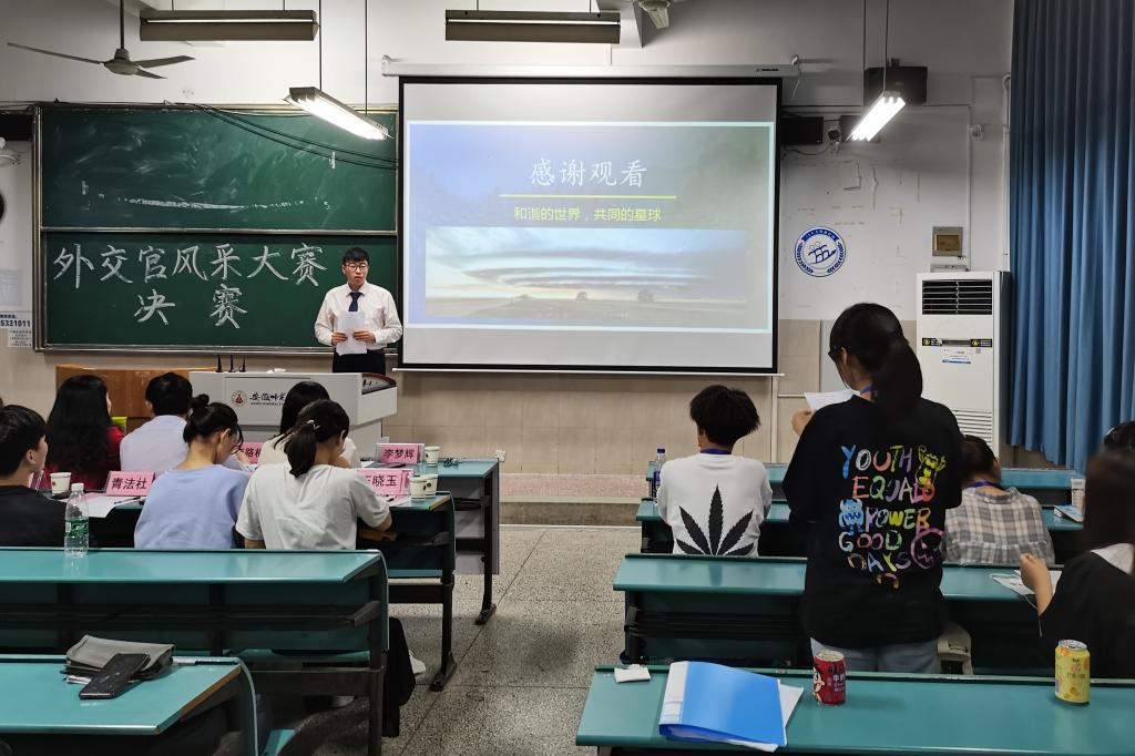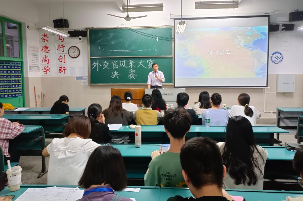 本网讯(外交与国际事务研究协会 胡凤仪)外交与国际事务研究协会于5月21日晚在行知楼2020201教室举办了第六届外交官风采大赛。外交与国际事务研究协会指导老师李路根、卢路以及会长团,青年法学社副会长李旭,职业能力发展研究会副会长李娜,团委社团管理部委员蒋紫薇担任本次比赛评委,参赛选手及工作人员出席活动。本次活动由活动部孙楠、韩莹莹主持。