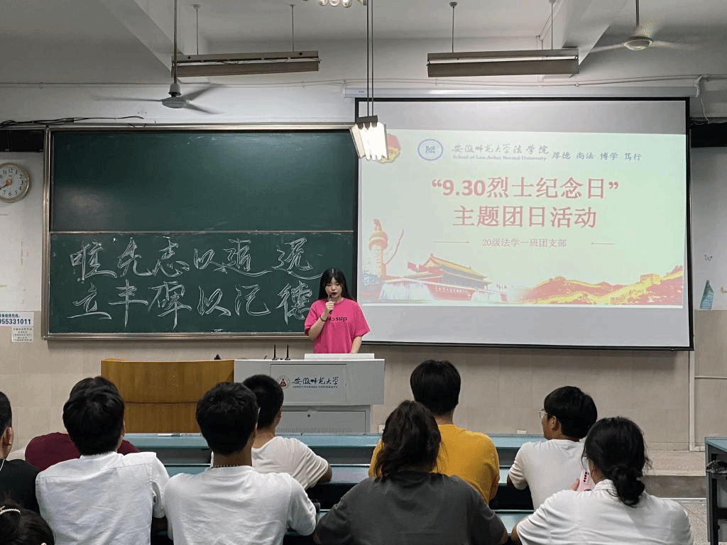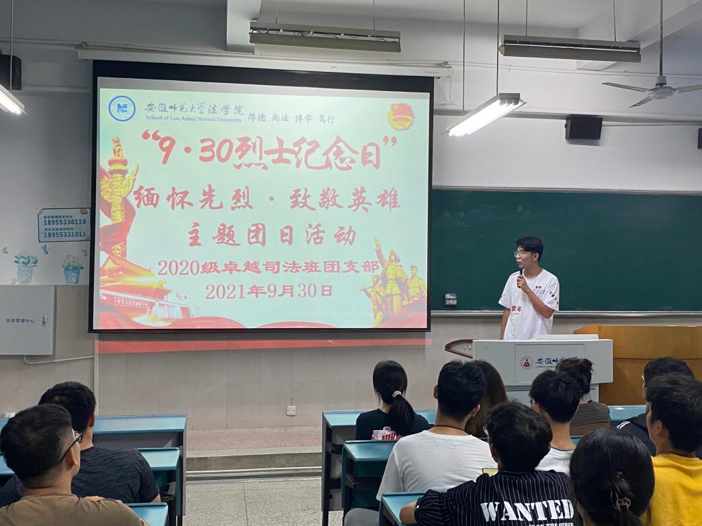 本网讯(崔健 王奕骁 杨珺 黄睿鑫)唯先志以追远,立丰碑以记德。为牢记历史,缅怀革命先烈,学习人民英雄的先进事迹,增强当代老员工的时代使命感和责任感,9月30日,2020级法学专业于2020304教室召开“9·30烈士纪念日”主题团日活动,会议由法学专业各班团支书主持,辅导员崔健全程指导。2020级法学专业全体同学共同参与。