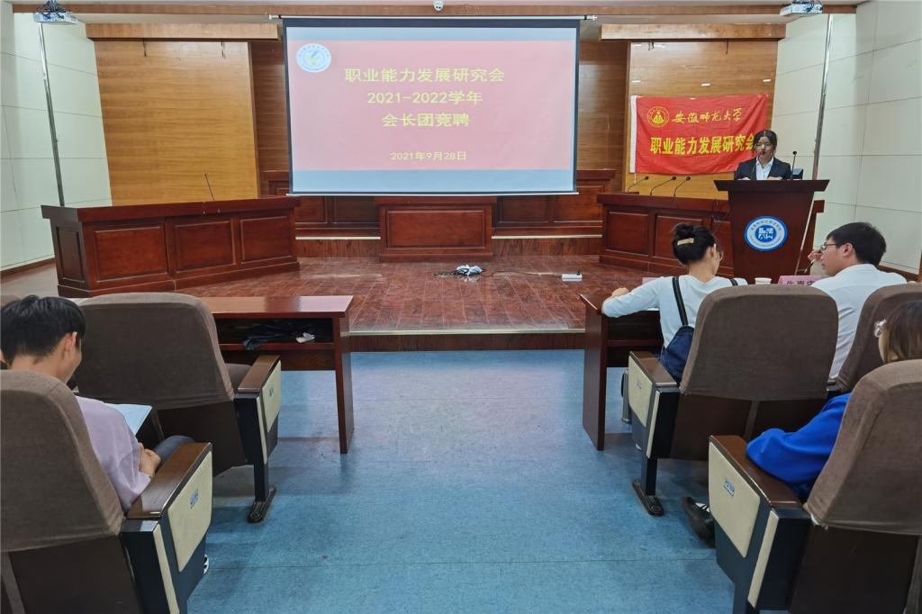 本网讯(职业能力发展研究会 李婉莹)为推动2021-2022学年社团工作的顺利展开,进一步加强组织建设,明确本学年活动日程安排,职业能力发展研究会特于9月28日在老员工活动中心模拟法庭举办2021-2022学年职业能力发展研究会会长团换届大会。职研会指导老师陈勇出席本次会议,会长团成员朱嘉庆、李娜、胡思杰以及各部门负责人及全体理事参与,综合部负责人胡佳鑫主持本次会议。