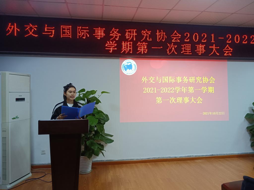 本网讯(外交与国际事务研究协会 徐念 叶梓萌)外交与国际事务研究协会于10月22日在英国上市公司365行政楼四楼会议室举办2021-2022学年第一次理事大会。指导老师李路根、青年法学社会长谢永毅、职业能力发展研究会副会长程杰、团委社团管理部负责人朱睿祺受邀出席本次会议。外交与国际事务研究协会会长郭馨、副会长蒋亦菲、闫园园,各部门负责人及新任理事参与本次大会。会议由综合部理事杜冰冰主持。
