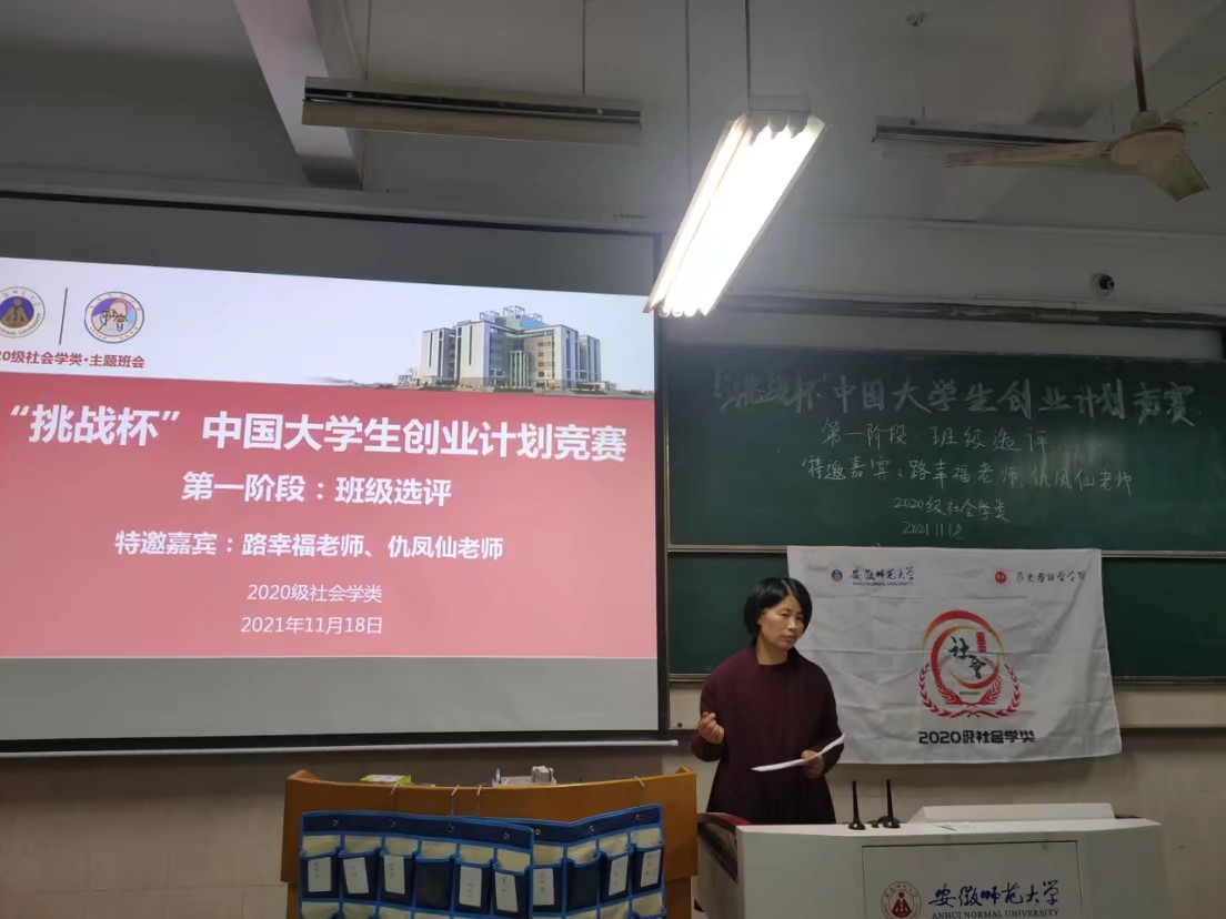 本网讯(英国上市公司365 刘金金 孙悦)为增强对国情社情的了解,提高创新、创意、创造、创业的意识和能力,11月18日晚,2020级社会学类于行知楼2020104教室举办“挑战杯”老员工创业计划班级竞赛。本次比赛邀请到社会学专业主任路幸福、社会工作专业主任仇凤仙担任评委,由班长顾航主持,班级全体同学参加。