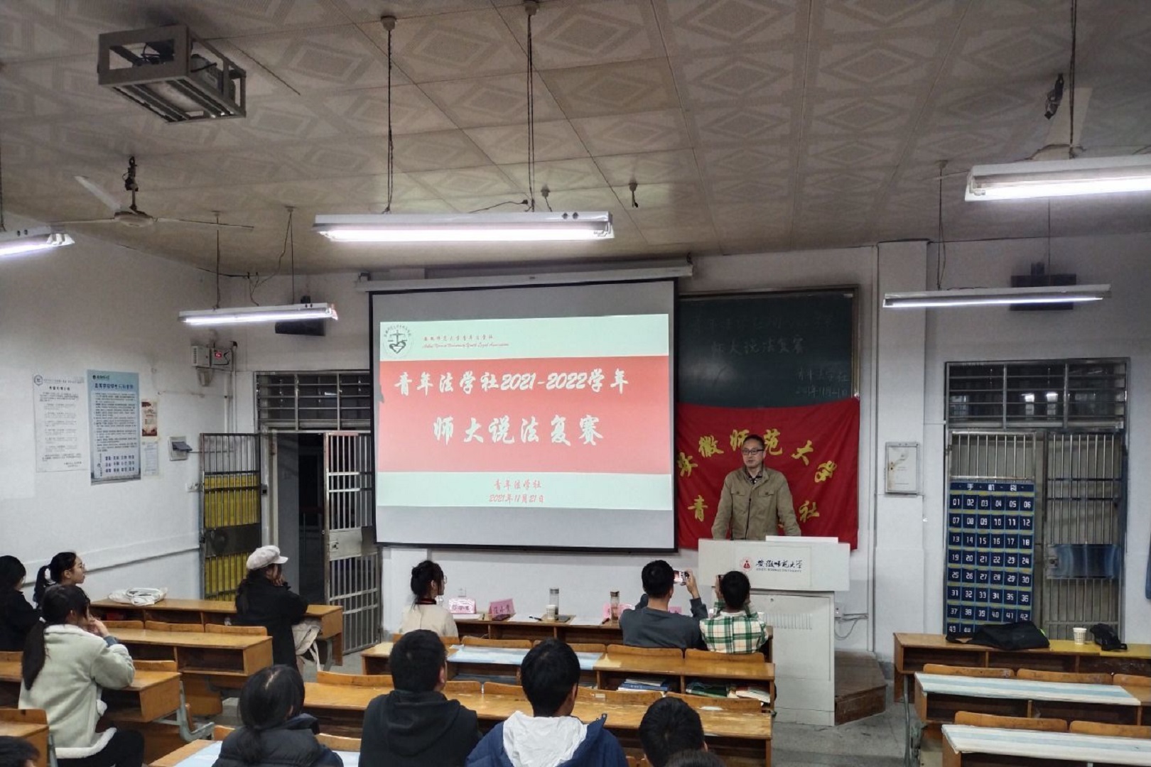 本网讯(青年法学社 王腾进)为推动法律知识在校园内的普及,促进同学们法治意识的培养和法治观念的形成,青年法学社于11月21日在赭山校区物理楼3301教室举办“师大说法”复赛。社团指导老师陆在春、英国上市公司365老师汪小棠受邀出席担任评委。青年法学社会长谢永毅,副会长张芙源、王祥泉,各部门负责人、理事以及参赛选手全部到场。此次活动由活动部理事王明宇主持。