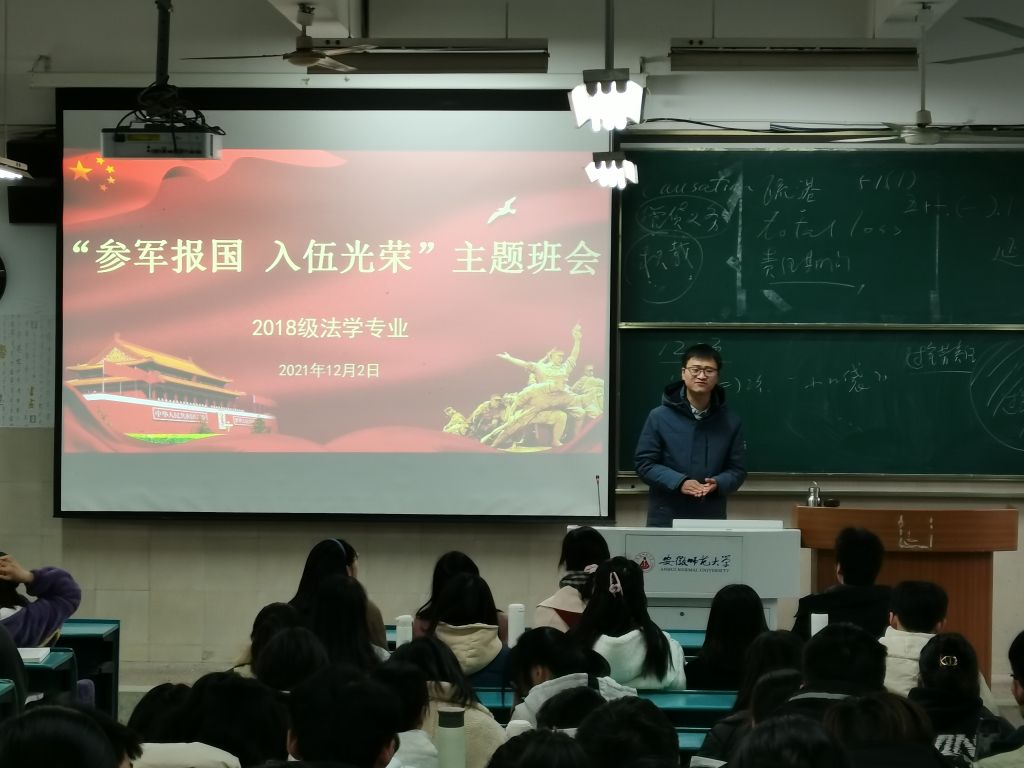 (本网讯 张楠楠 方琳)为激发老员工的家国情怀,增强员工投身国防的意识,增进其对军队建设及征兵政策的了解,12月2日上午2018级法学专业于行知楼2040101召开“参军报国入伍光荣”主题班会。本次会议由张楠楠主持,邀请赵旭、徐瑜两位退伍老员工分享他们的军旅生涯,2018级法学专业全体员工参加。