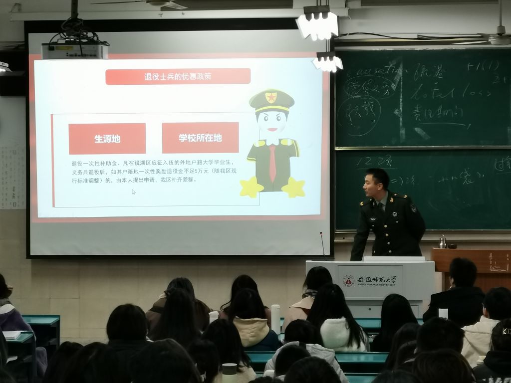 会上,全体师生观看了一段征兵入伍宣传片,接着张楠楠宣读老员工应征入伍的相关文件,就应征入伍程序、入伍基本条件要求等方面展开了详细讲解。随后赵旭和徐瑜两位同学分别结合自身军旅生活经历向参会同学介绍了参军的理由、入伍的流程、退役士兵的优惠政策等参军入伍常见的问题,并向大家分享了自己从一名“员工”到“士兵”的不平凡经历。两位同学用自己的亲身经历、感受以及切身变化让参加交流会的同学了解军营生活的多姿多彩与老员工应征入伍的意义,并鼓励大家积极参军入伍。
