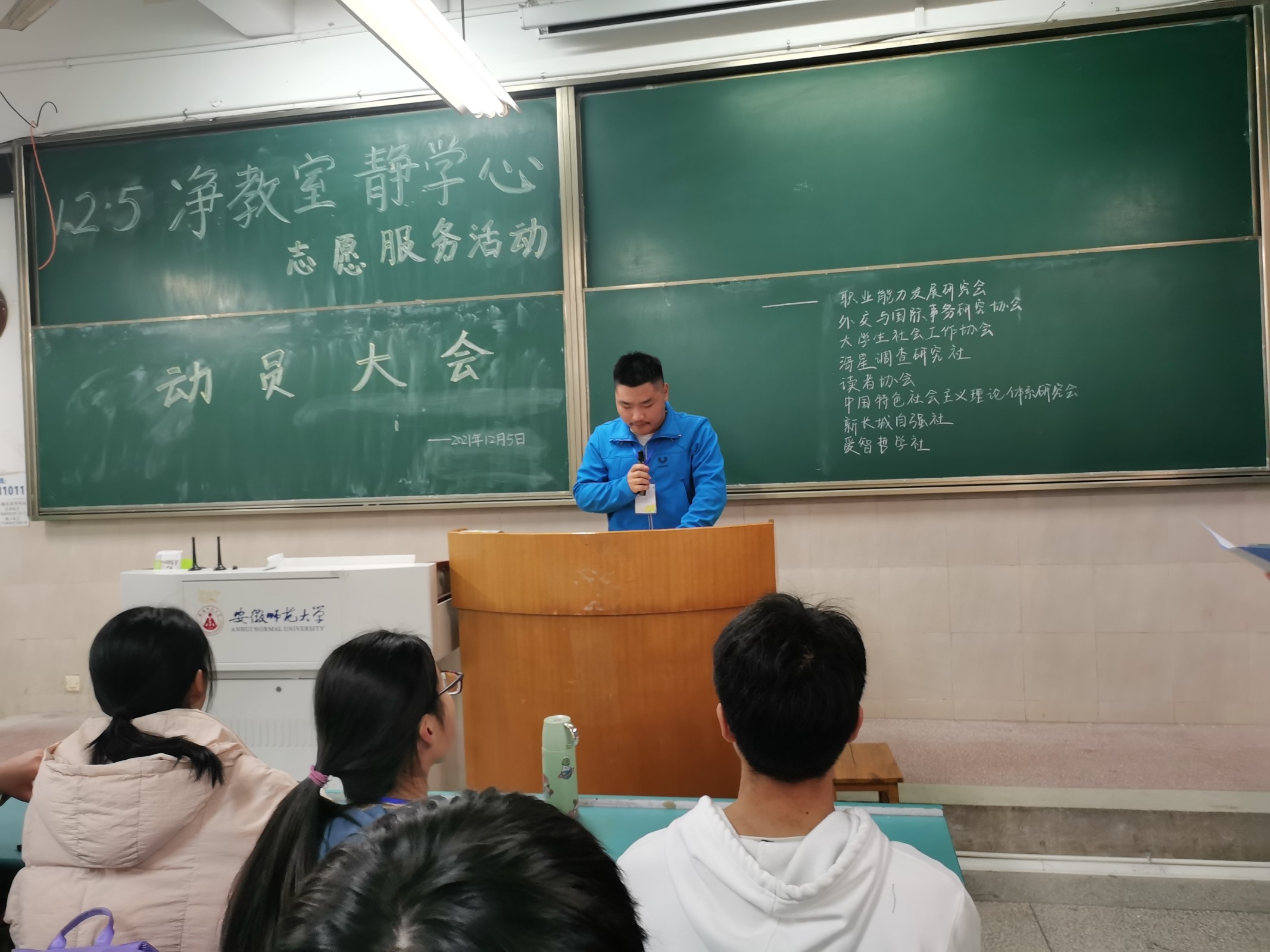 本网讯(职业能力发展研究会 方芷若)为了创造良好的学习环境,丰富员工课余生活,强化服务意识,培养志愿者精神。12月5日,职业能力发展研究会同外交与国际事务研究协会、老员工社会工作协会、海星调查研究社、读者协会、爱智哲学社、中国特色社会主义理论体系研究会及新长城自强社于行知楼2020103联合举办12·5“净教室,静学心”志愿服务活动,八大社团负责人、部门负责人及理事全部到场。活动由职研综合部理事熊芮主持。