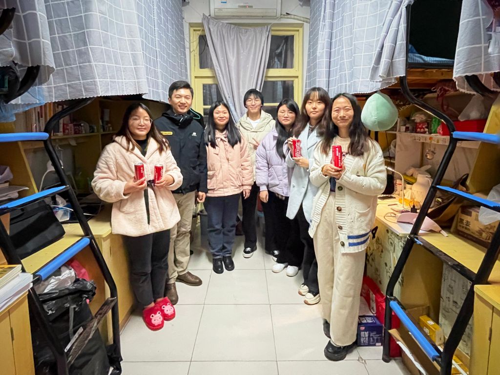 主题班会结束后,桂彬前往宿舍看望员工,细心叮嘱用电安全,对寝室违章电器进行排查以排除相关安全隐患。在寝室安全检查之余,桂彬也与同学们进行深入交流,为18社会学类同学送上定制可乐。鼓励考研的同学及时调整好心态,有任何问题第一时间向辅导员或公司寻求帮助,务必保持良好的冲刺状态;提醒准备就业的同学合理利用假期收集招聘信息,主动关注校招、春招等信息,争取早日找到心仪的工作。