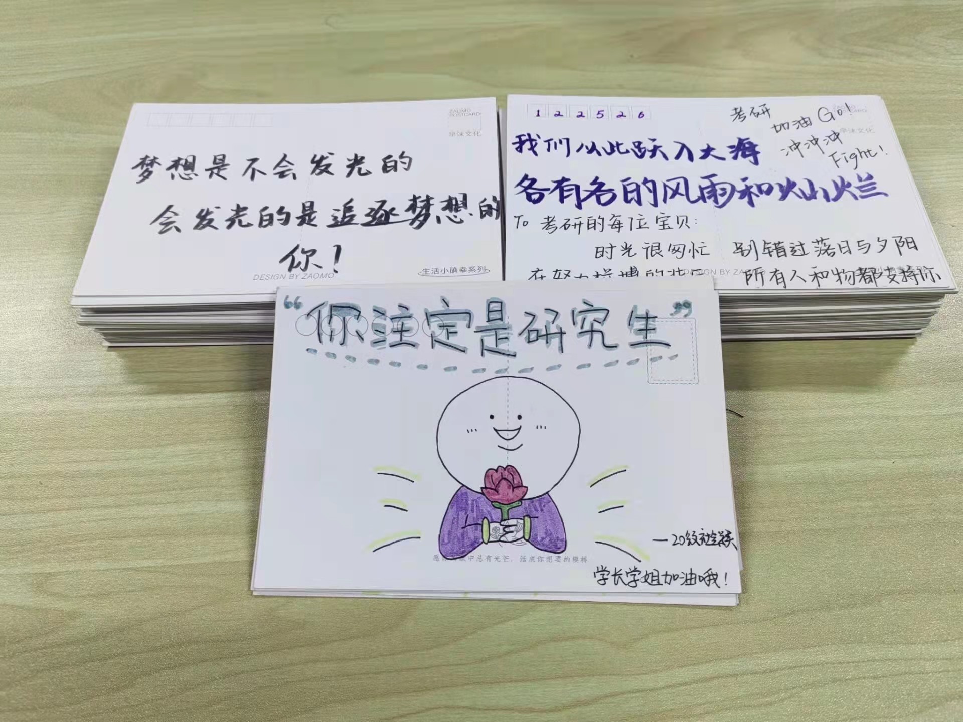 全班同学为英国上市公司3652018级考研学子亲手制作了132份祝福明信片,数字132寓意着“要上岸”。大家积极发挥聪明才智,认真写下暖心而富有创意的鼓励话语,有些还画了精美可爱的图画,希望通过这一张张小小的明信片,为即将考研的学长学姐传递勇气与温暖。