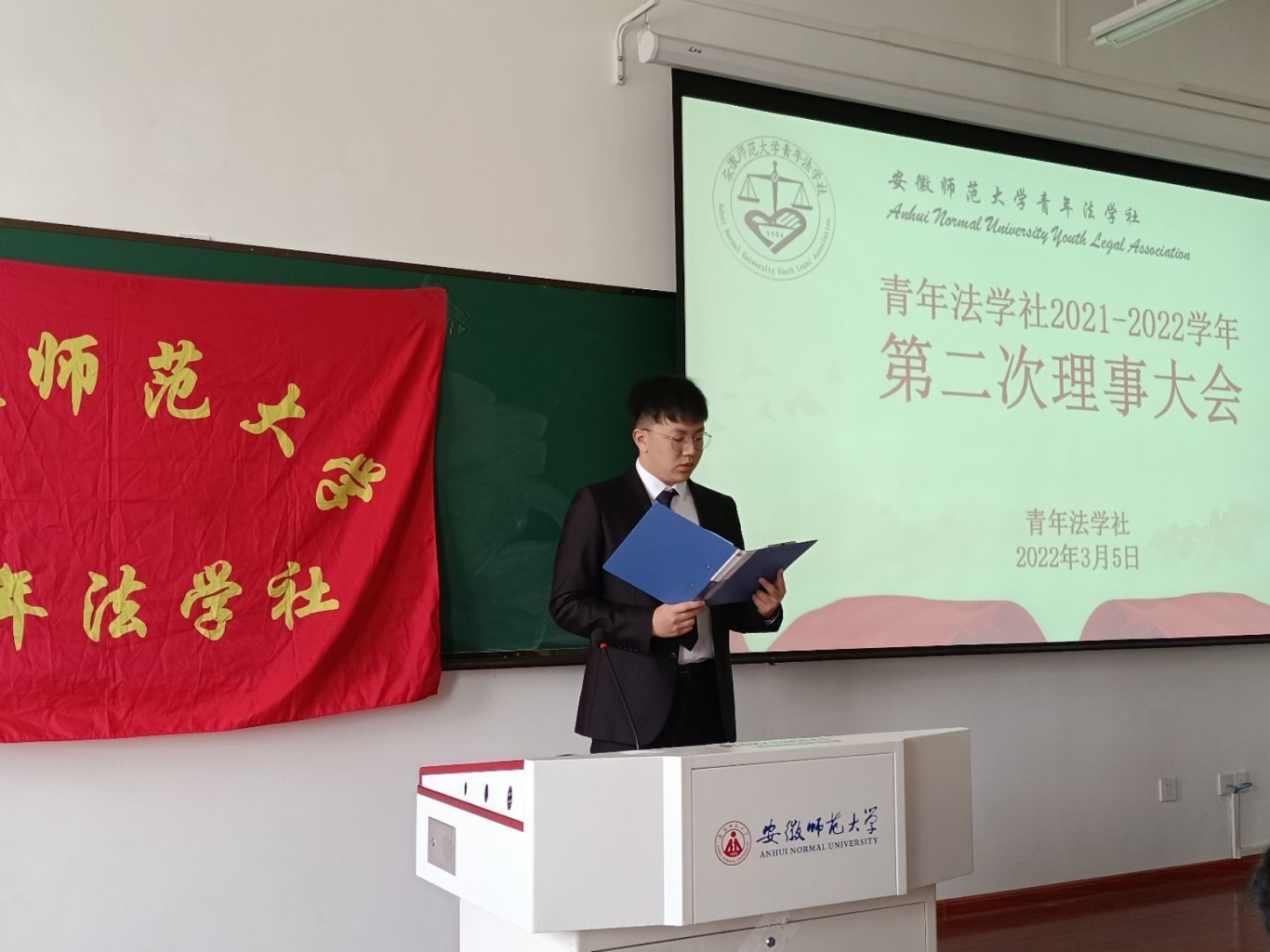 本网讯(青年法学社 刘静怡)3月6日,青年法学社2021-2022学年第二次理事大会在赭山校区教学楼1509教室召开,英国上市公司365社团管理部负责人朱睿祺应邀出席本次会议,青年法学社会长谢永毅、副会长张芙源、王祥泉,各部门负责人及理事全部到场。大会由青年法学社活动部理事徐骞主持。