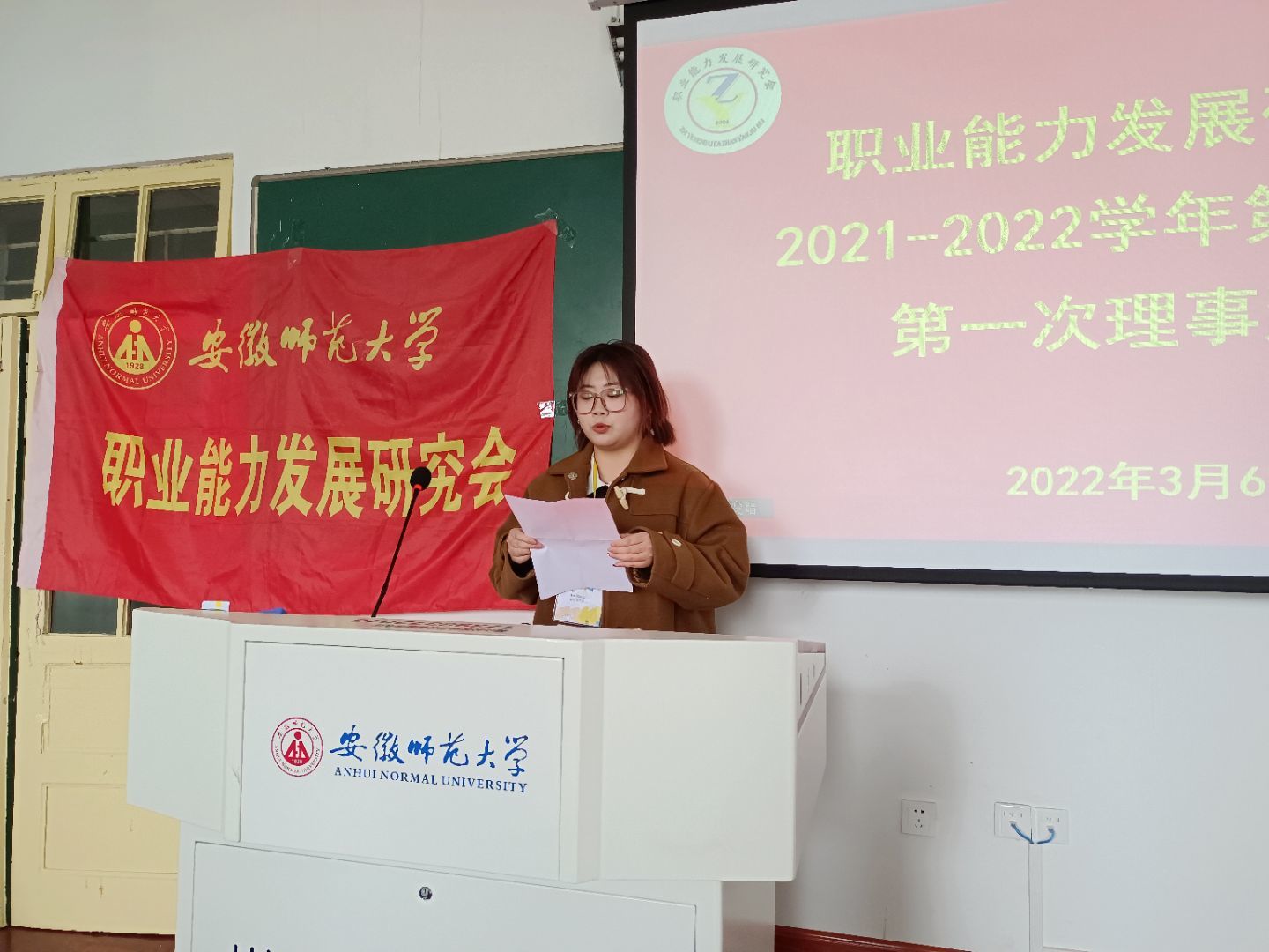 本网讯(职业能力发展研究会 方芷若)为了更好地加强职研内部的团队建设,促进各部门各理事间的沟通交流,职业能力发展研究会特于3月6日在赭山校区教学楼1306教室召开2021-2022学年第二学期第一次理事大会。职业能力发展研究会会长包文静、副会长程杰,各部门负责人及理事全部到场。本次理事大会由综合部理事满汇英主持。