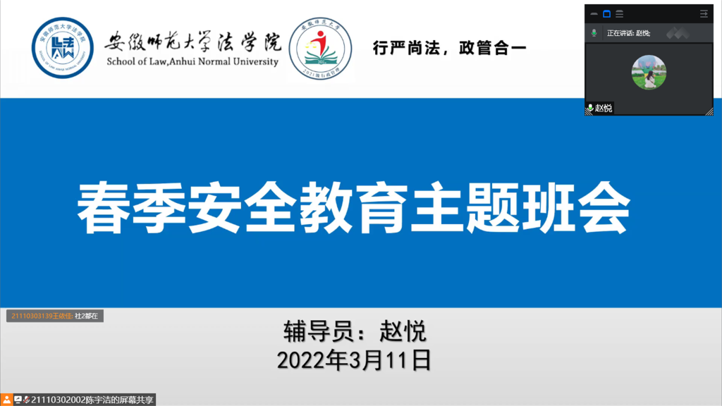 在疫情防控安全方面,赵悦强调当前全国疫情防控形势复杂,呈多地散发趋势,务必绷紧疫情防控这根弦。一旦发现安庆、宿州、南京、杭州、上海、青岛、吉林等地密接者,立即上报;班级安全委员实时关注中高风险地区变化,同学们根据动态调整实时上报;特殊时期,尽量减少网购,配合校园防疫工作。在日常生活方面,赵悦提醒同学们切勿麻痹大意,夯实安全基础。每一位同学都要做到加强日常考勤,严格落实疫情防控表单填写、今日校园晚点名、出入校园扫码等工作;遵循“非必要不离芜”原则,尤其不得前往中高风险地区。班集体多措并举,落细落实各项防控措施,才能做到严把疫情关卡,织牢防疫“安全网”。在政治思想安全方面,赵悦结合疫情持久思想波动和春季思想调研情况,提醒班委成员和入党积极分子要以身作则,提高政治站位,深入学习习近平总书记关于总体国家安全观、网络安全、疫情防控等的重要讲话指示批示精神,尤其是网络安全方面,要做到不信谣不传谣、不随意转载网络不实信息,从而牢固树立网络安全底线思维。