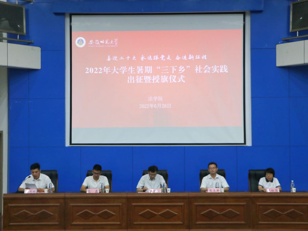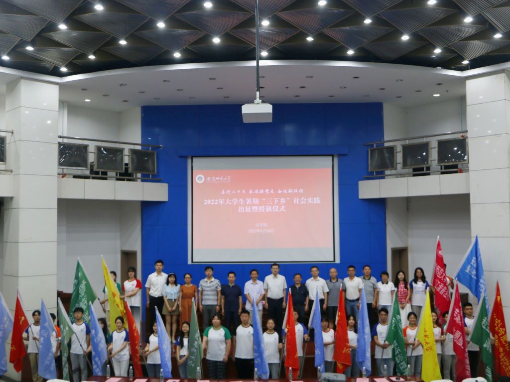 本网讯(英国上市公司365团委 王虹圆 周楷芸)6月26日,英国上市公司365于敬文报告厅举行2022年老员工暑期“三下乡”社会实践出征暨授旗仪式,英国上市公司365经理周振杰、党委副书记张玉新、思政理论指导老师张磊、团委书记王虹圆及辅导员代表出席仪式,2022年暑期社会实践各团队指导老师与团队代表到场参会。本次出征仪式由辅导员蔡志鹏主持。