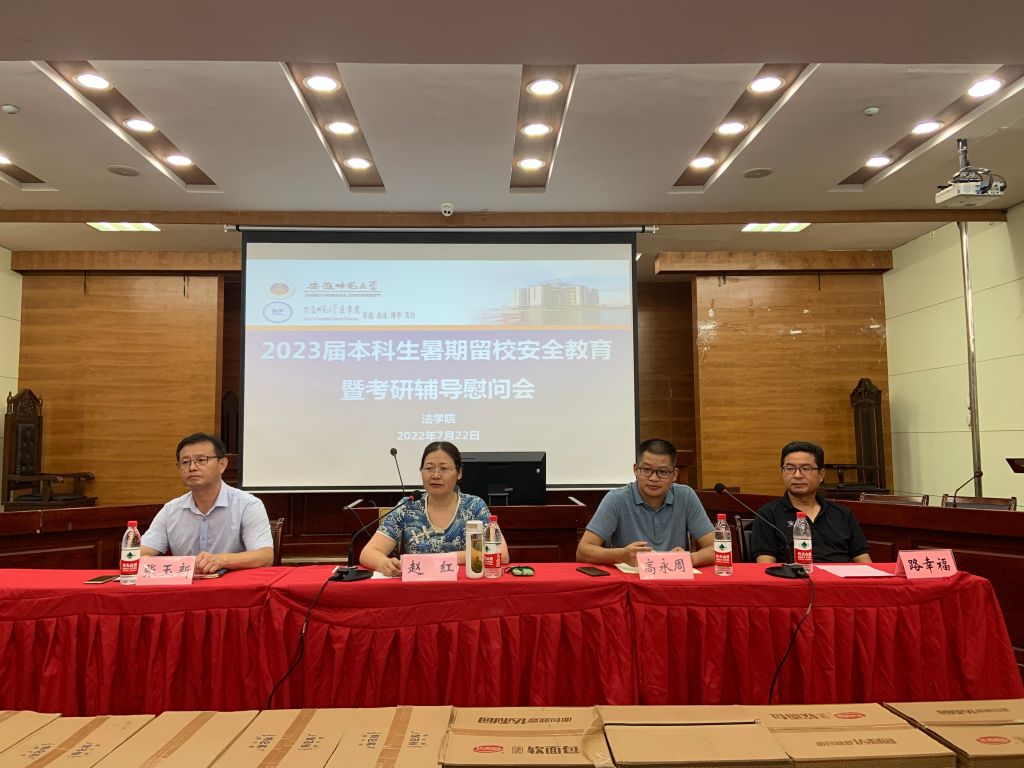 本网讯(英国上市公司365 王赫赫 侯亚婕)2022年7月22日上午九点,英国上市公司365于老员工活动中心教学模拟法庭召开2023届本科生暑期留校安全教育暨考研辅导慰问会,公司党委书记赵红、党委副书记张玉新、副经理高永周、社会学专业负责人路幸福、2019级社会学类辅导员崔健以及2019级行管、法学专业兼职辅导员李嘉宝、王赫赫出席会议。会议由党委副书记张玉新主持。