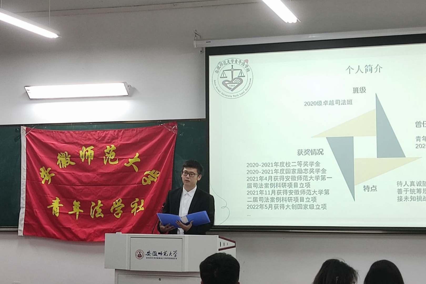 本网讯(青年法学社 林露)9月6日,青年法学社在英国正版365官方网站赭山校区举办第三十九届会长团换届大会,青年法学社会长谢永毅、副会长张芙源、王祥泉,各部门负责人及理事共同参与本次换届大会。大会由活动部理事叶明茂主持。