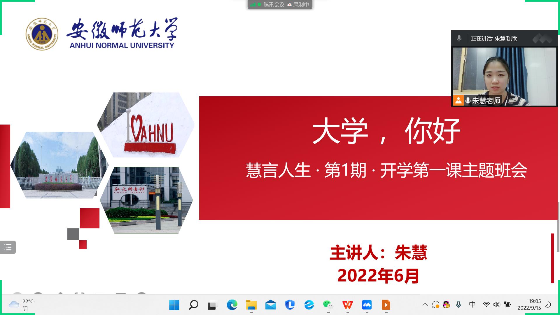 从全从细从严管,织密入学教育“防火墙”。为帮助新生尽早适应大学,迎新工作结束后,15日晚,朱慧召开开学第一课主题班会。主题班会,展望大学。班会中,朱慧以“大学,你好”为主题,并向同学们发问:大学之问、成长之问、践行之问。朱慧指出,大学不是终点,而是新的起点。朱慧呼吁同学们在认真思考以后写一封“致四年后的自己”一封信。随后,朱慧就近期核酸检测、档案收缴、贫困生申请认定等安排进行了说明。走访寝室,强调安全。班会结束后,朱慧前往寝室查寝。朱慧细心询问新生在生活、学习等方面是否存在问题并进行了详细的解答。同时,她提醒新生们一定要提高警惕意识,拒绝一切手机卡、宽带的上门推销,谨防电信诈骗。