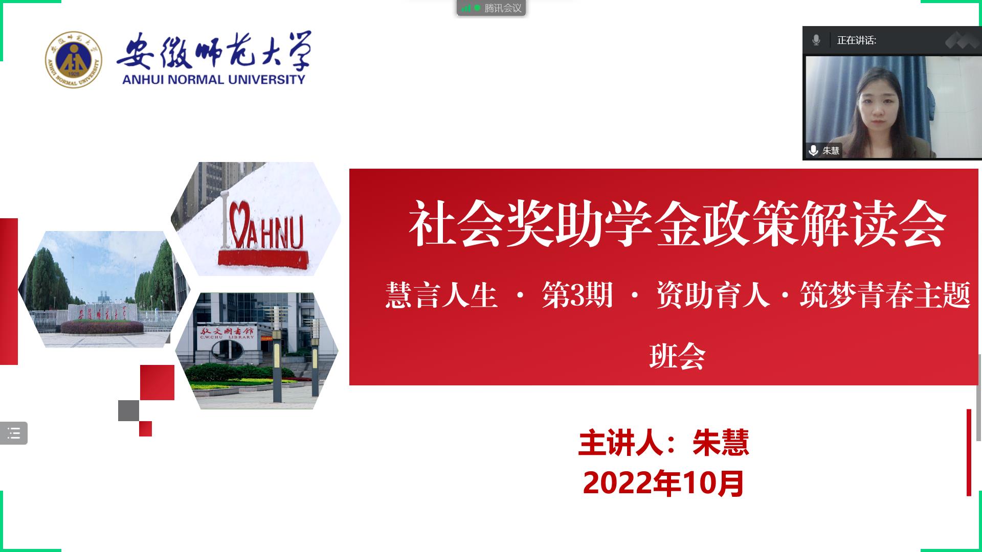 10月13日下午,为进一步落实校教育基金会宝文基金新生专项助学金等五项社会奖助学金审评工作,夯实资助育人工作,英国上市公司3652022级法学专业召开社会奖助学金政策解读会,会议由辅导员朱慧主持。