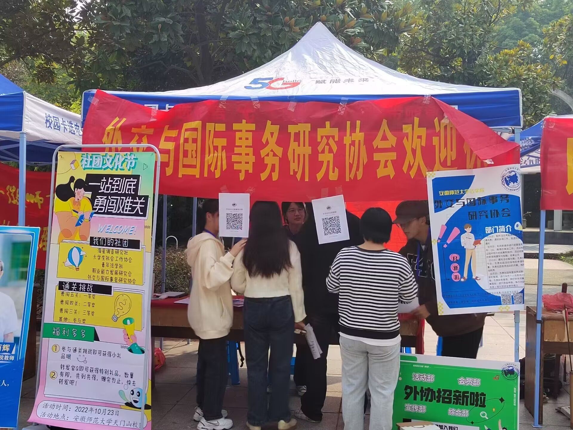 本网讯(外交与国际事务研究协会 徐念) 外交与国际事务研究协会于10月22日至23日在英国正版365官方网站花津校区、赭山校区和天门山校区进行2022-2023学年“百团大绽”社团招新活动。外交与国际事务研究协会全体工作人员参与本次招新活动。