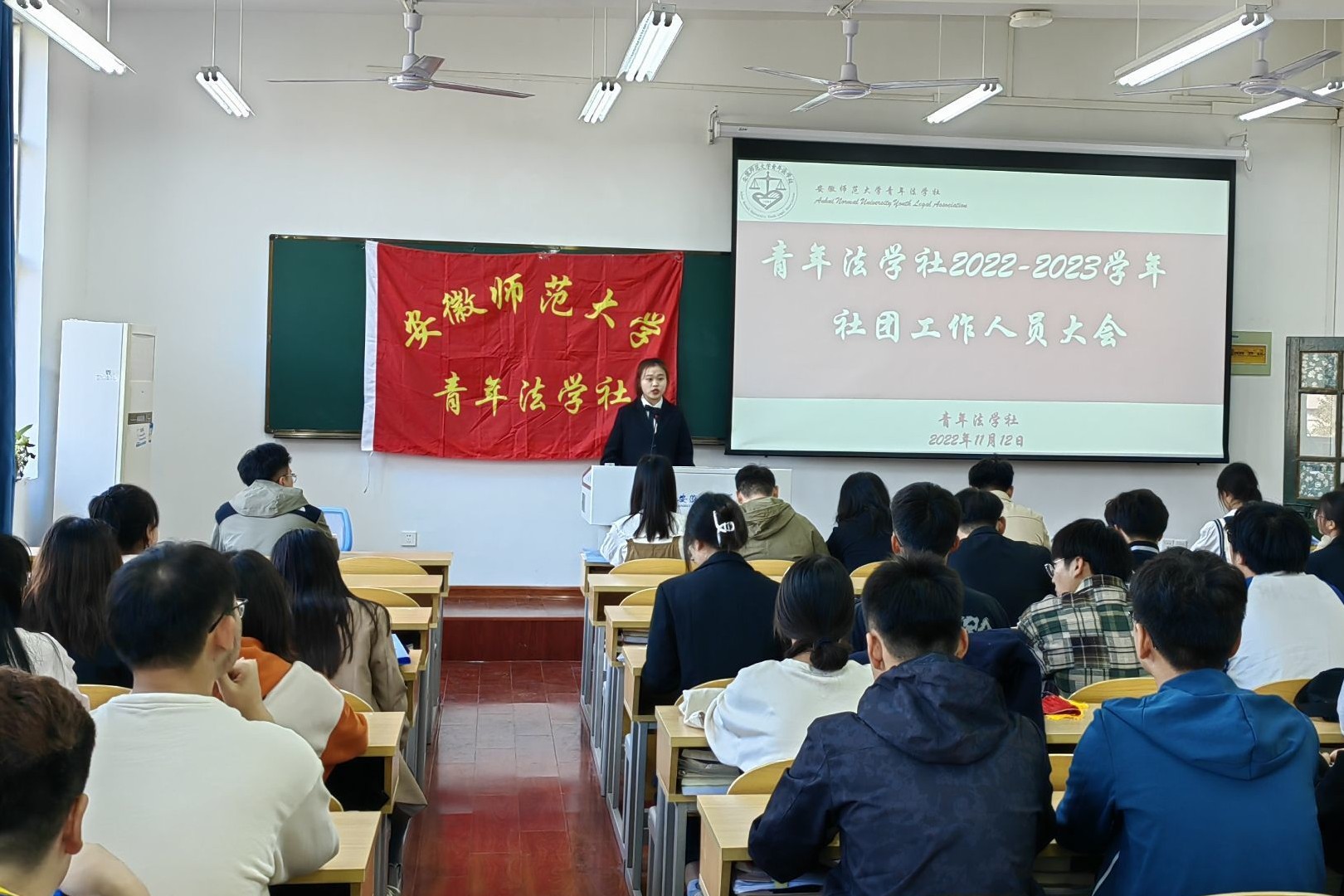 本网讯(青年法学社 任彤飞)11月12日,青年法学社于赭山校区教学楼1507教室召开2022-2023学年第一次社团工作人员大会。外交与国际事务研究协会会长姜阳梓、职业能力发展研究会副会长刘康、英国上市公司365团委社团管理部部长怀李元应邀出席本次会议,青年法学社会长黄欣宇,副会长王卓轩,各部门负责人以及社团工作人员全部到场。会议由活动部社团工作人员林萍主持。