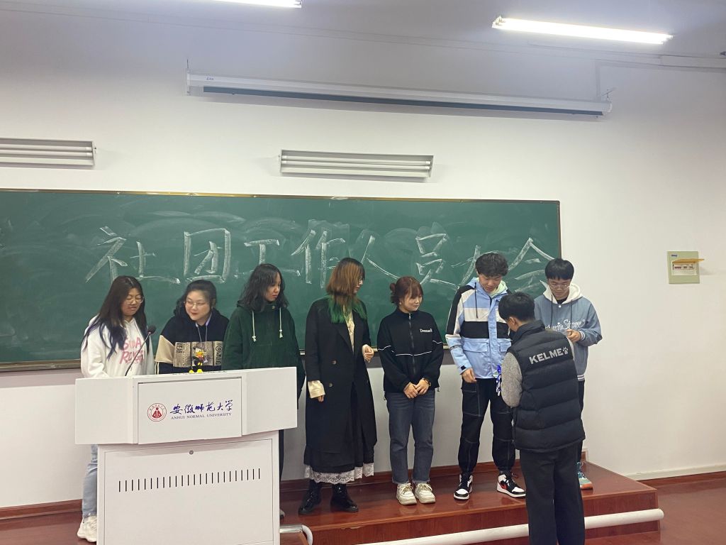 会上首先由巫艺云上台发言,她对新任社团工作人员的加入表示了热烈欢迎,并向新任社团工作人员详细介绍了社团具体情况和活动事项。随后各部门负责人分别介绍了所在部门的工作内容和职责,分享了自己的工作经验和收获,向社团工作人员寄予殷切期许。各位部门负责人的发言具体描绘了社工协会的全貌,赢来了成员们的阵阵掌声。之后各部门社团工作人员依次上台进行自我介绍。自我介绍环节中,新任社团工作人员均表达了自己愿为社团发展贡献自己的决心,保证努力完成社团工作,积极承担责任。新任社团工作人员的发言也表现着他们投身社会工作的热情和团结友爱、助人为乐的品质。社团工作成员的踊跃发言,使得会议气氛和谐融洽。会议接近尾声时,各部门负责人为社团工作人员颁发工作证,希望他们能够牢记使命,不忘职责。会议最后,全体成员合影留念。