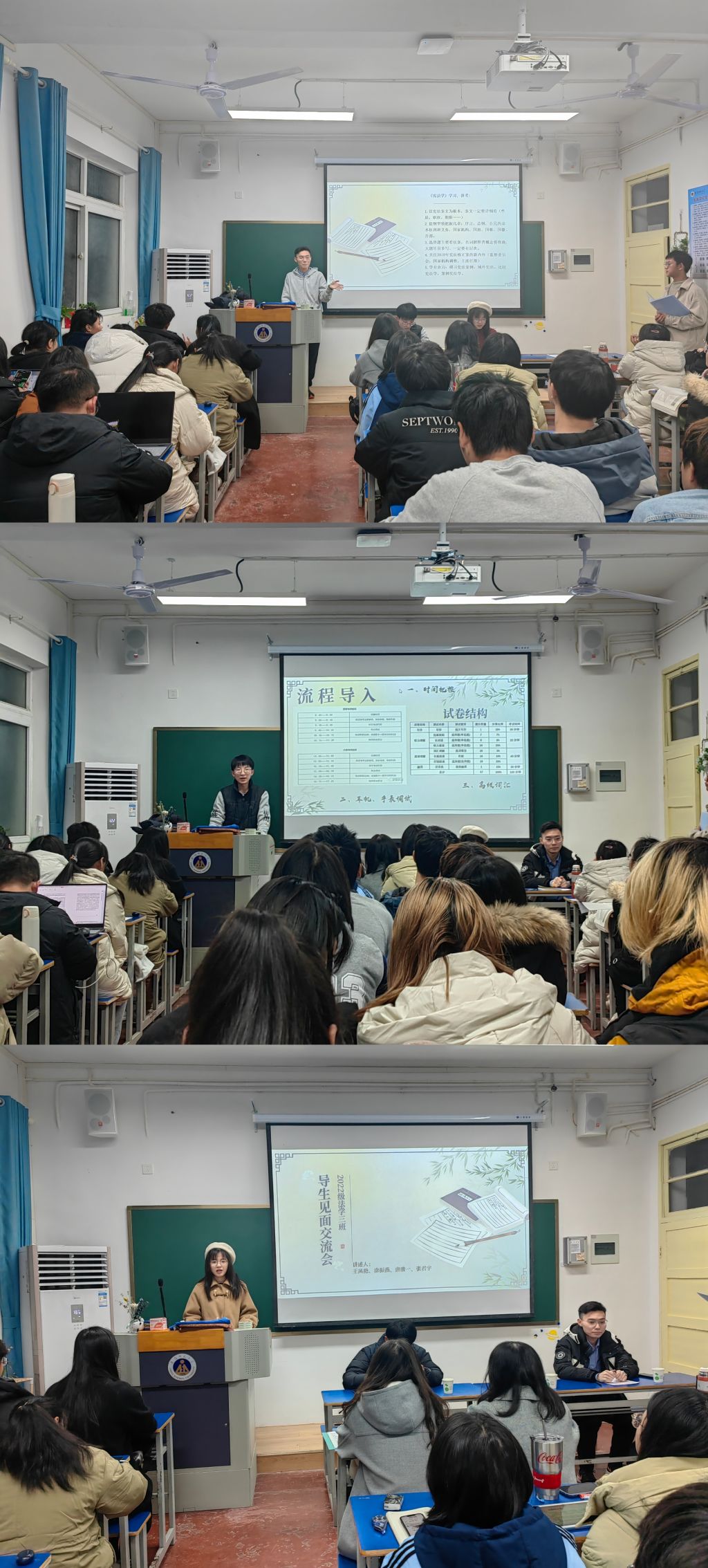 2021级法学专业刘艳茹、张长甲和李响响三位导生受邀来到2022级法学二班。三位导生分别就英语四六级和期末考试备考等方面的内容向同学们分享学习方面的经验,向大家提出均衡合理安排员工组织工作和个人生活的建议,同时也提出在大一阶段要以学习为重,但也应该适当放松享受生活。三位导生结合个人实际介绍了学习方法、考试技巧和复习方法等一系列经验。