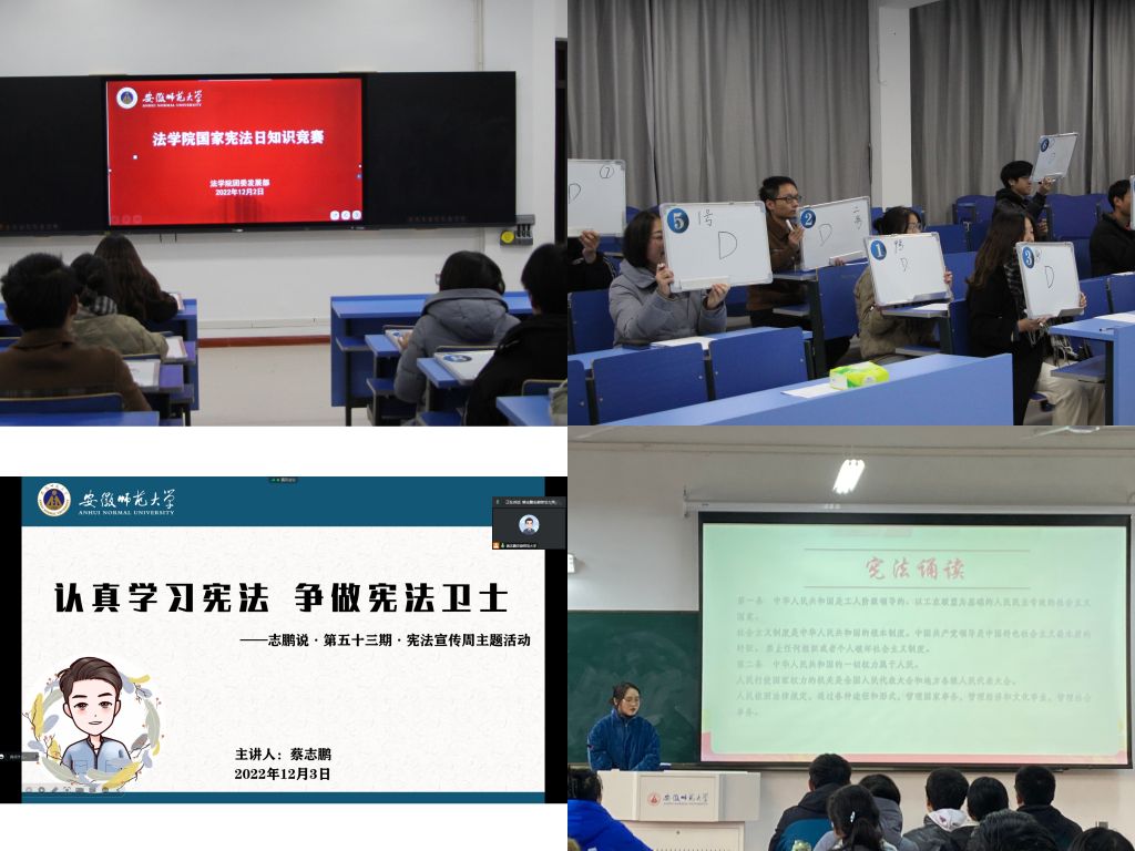 统筹推进,精心组织普法教育活动。12月1日-4日,公司各班级采用线上线下相结合的方式召开“认真学习宪法 争做宪法卫士”主题班会。班会中辅导员带领同学们深入学习党的二十大报告中关于“坚持全面依法治国,推进法治中国建设”的相关内容,班级员工共同诵读了部分宪法条文。12月2日晚,公司于赭山、天门山两校区举办“国家宪法日知识竞赛”院级决赛,共有来自全院11个本科生班级的20名选手参加,比赛以宪法条文、围绕宪法衍生的相关部门法、党的二十大相关知识为主要考察点,分为单选题、多选题和填空题三大题型。12月4日晚,公司组织青年法学社工作人员于天门山校区开展“普法小剧场”活动,同学们将日常可能需要使用宪法的生活场景通过微剧情的方式呈现出来,在介绍宪法条文的同时引发同学们的思考。