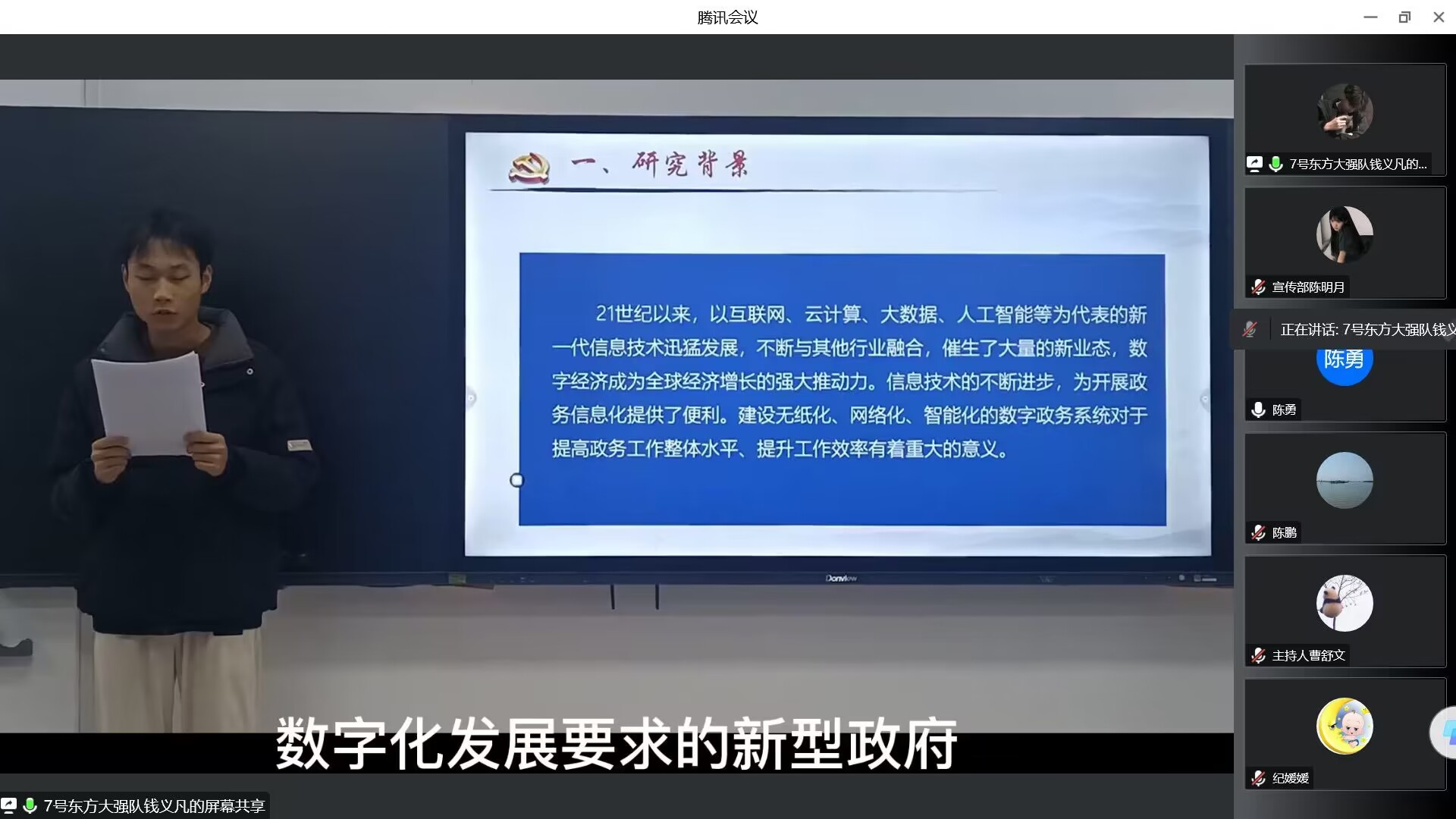 在模拟政府大赛开始前,工作人员就通过线上线下的方式对此次活动进行了宣传,同学们对此次活动表现出了极高的热情。本次模拟政府的主题为数字政府的建设。参赛队伍以录制视频的方式阐释了自己对数字政府的的理解、数字政府的不足以及对建设数字政府的建议。参赛的每个队伍、每位同学都可圈可点。九支队伍通过PPT、视频的方式解读数字政府:解释数字政府的含义与影响、指出数字政府的不足、为数字政府建言献策等。小组答辩环节,陈鹏、陈勇、纪媛媛老师进行了提问,考验了选手们的灵活能力与应变能力。比赛结束后,三位老师也对此次活动表示了肯定的态度,同时也一针见血地指出了活动的不足之处,希望以后可以做得更好。
