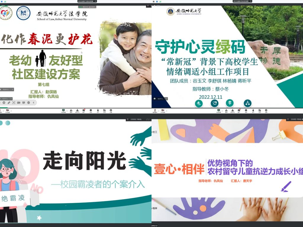 比赛分为汇报和答辩两个环节,共11支队伍参加。汇报环节中,各队代表根据实践选题,围绕时事热点,以PPT的形式结合项目背景、理论依据、项目目标、项目实施、项目评估等方面进行汇报。选手们选材新颖内容丰富,图文并茂生动形象,项目涉及个案、小组、社区多种工作方法,充分体现了选手们扎实的专业基础。
