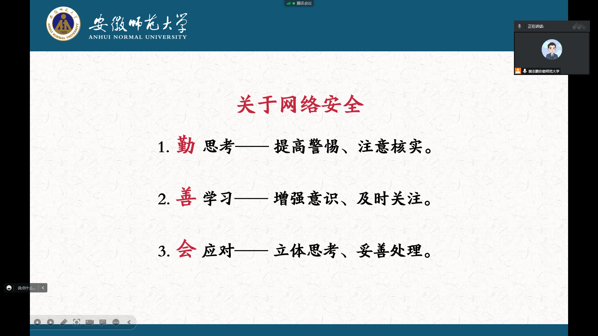 蔡志鹏从班级同学网络使用情况调查问卷结果说起,对同学们网络使用过程中常见的网络造谣事件、网络电信诈骗、网络舆论裹挟等问题进行了剖析和讲解。蔡志鹏要求同学们在使用网络过程中要勤 思考,提高警惕、注意核实信息真伪;善学习,增强意识、及时关注时政信息;会应对,立体思考、树立正确网络文明观念。
