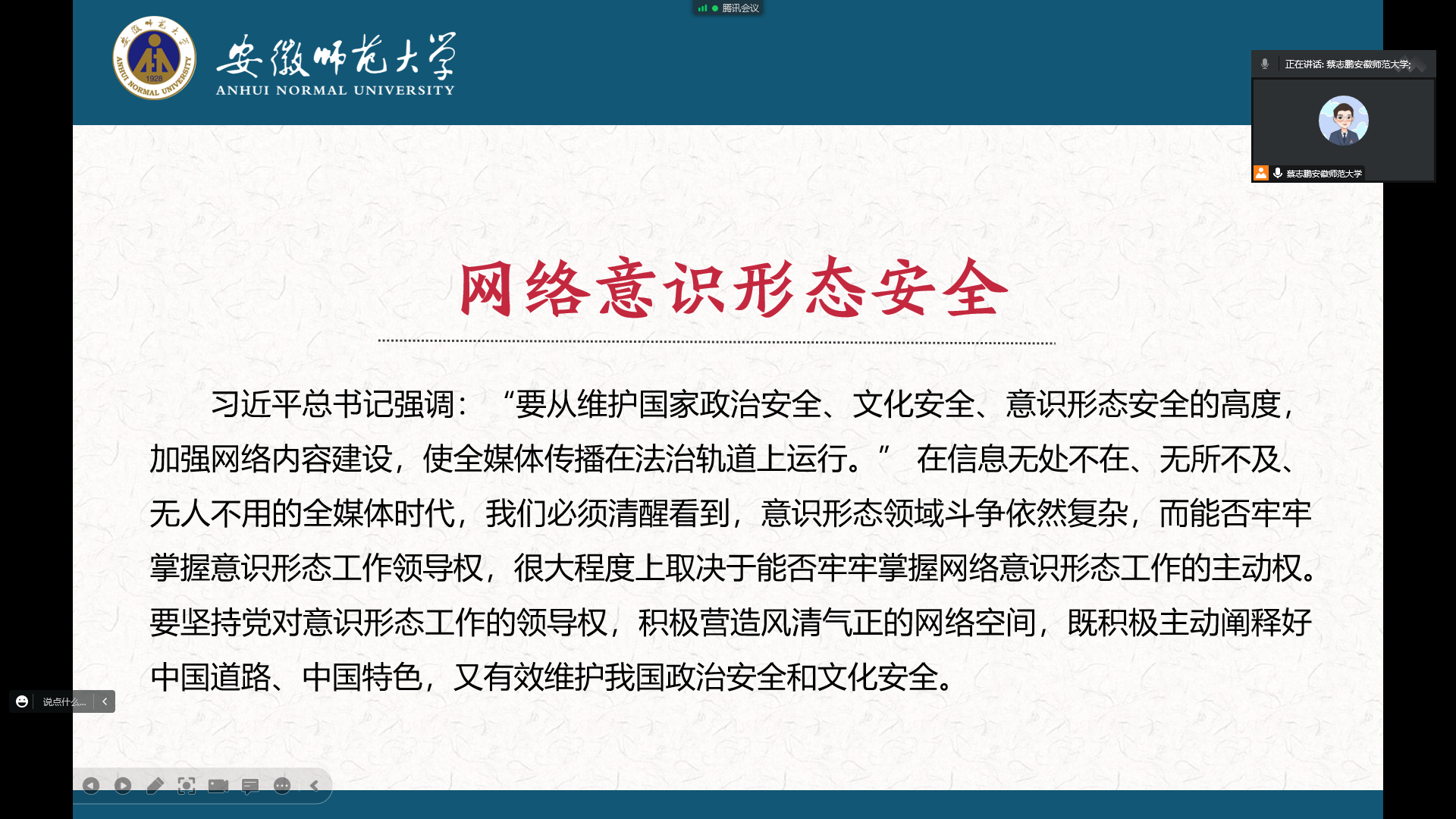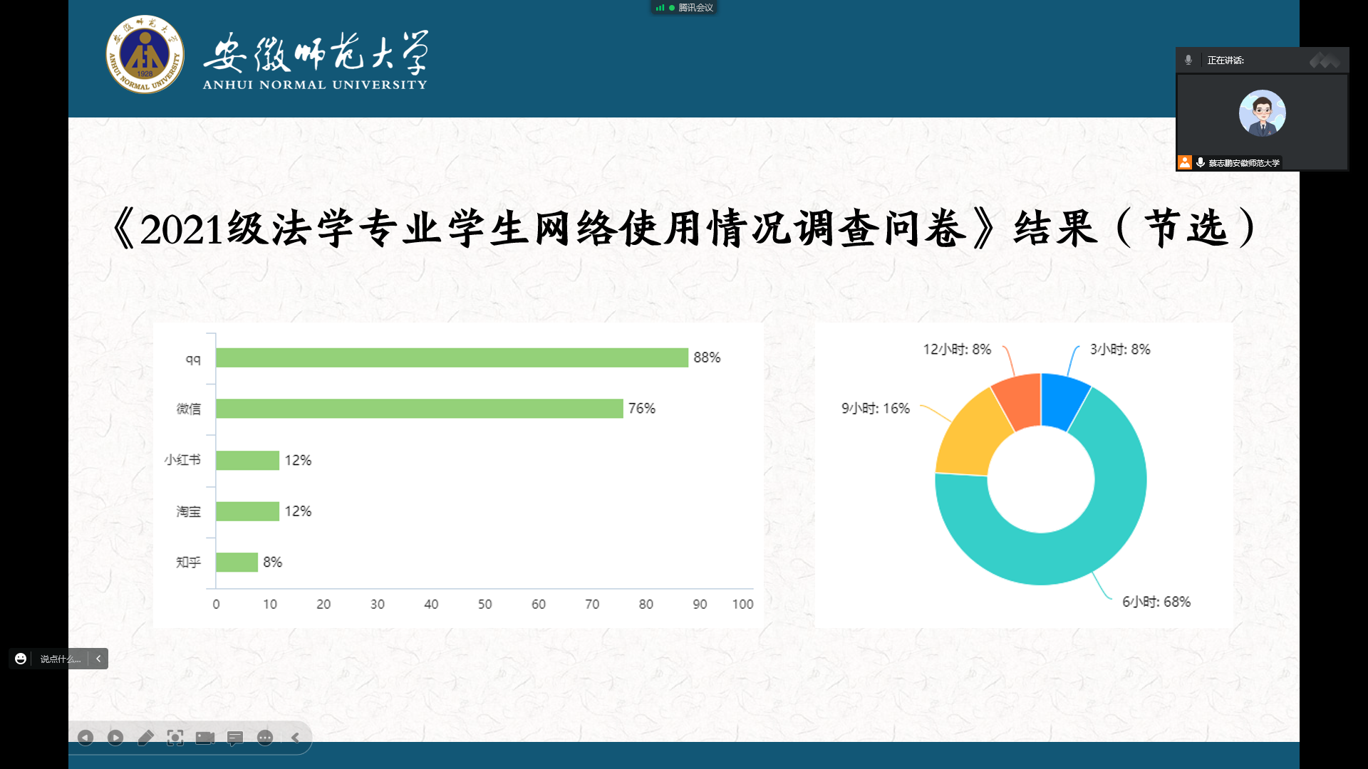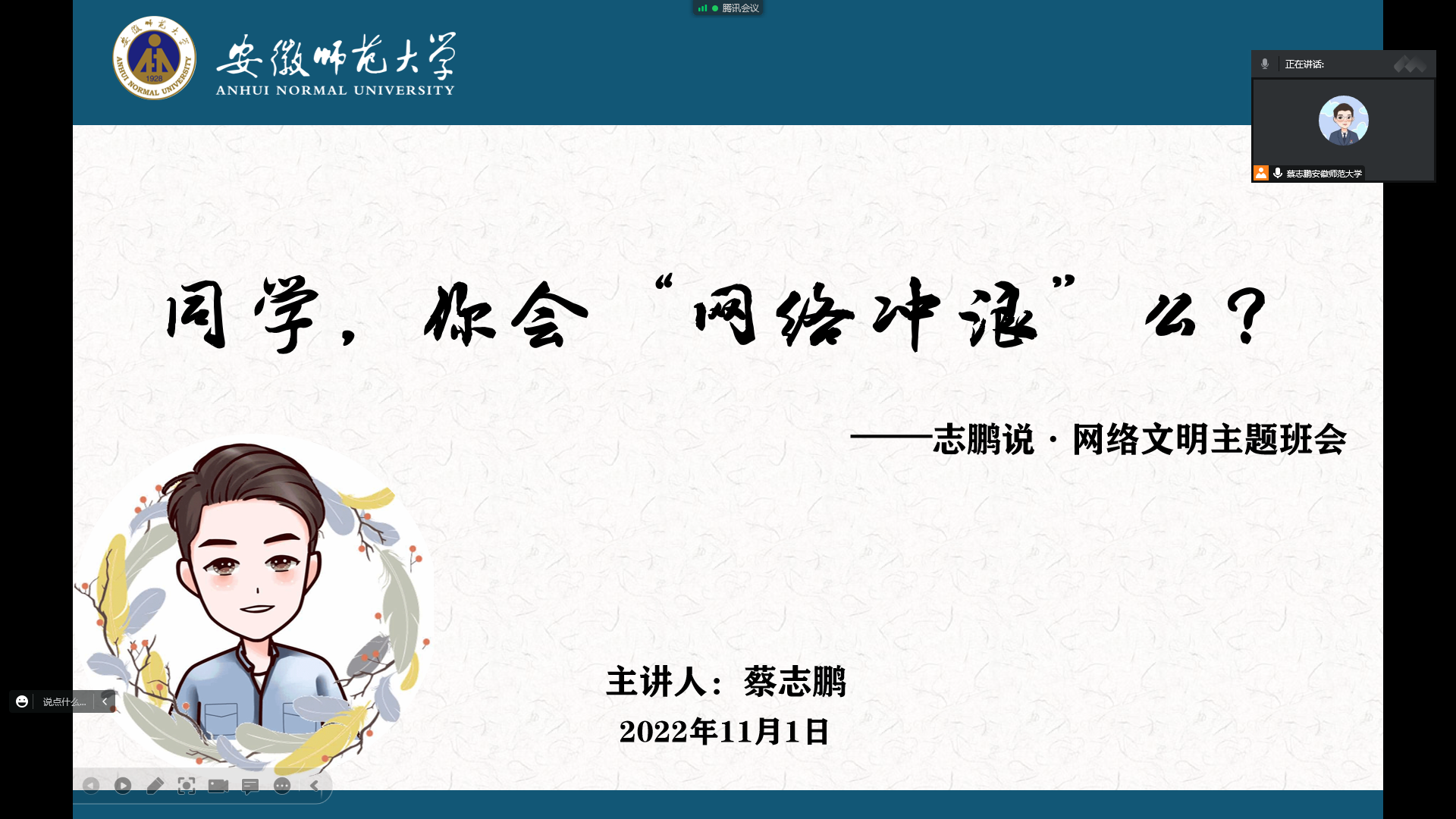 为了加强班级员工网络素养,培养“守公德、明是非、会上网”的新时代好网民,11月1日晚,2021级法学专业于线上召开网络文明主题班会,班级全体同学参加,班会由辅导员蔡志鹏主持。