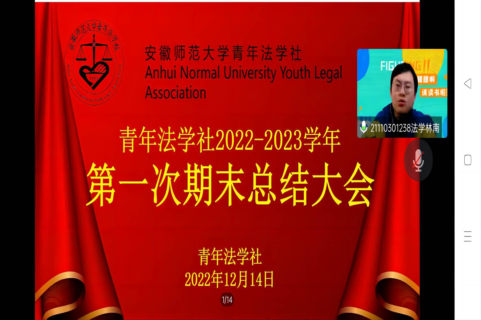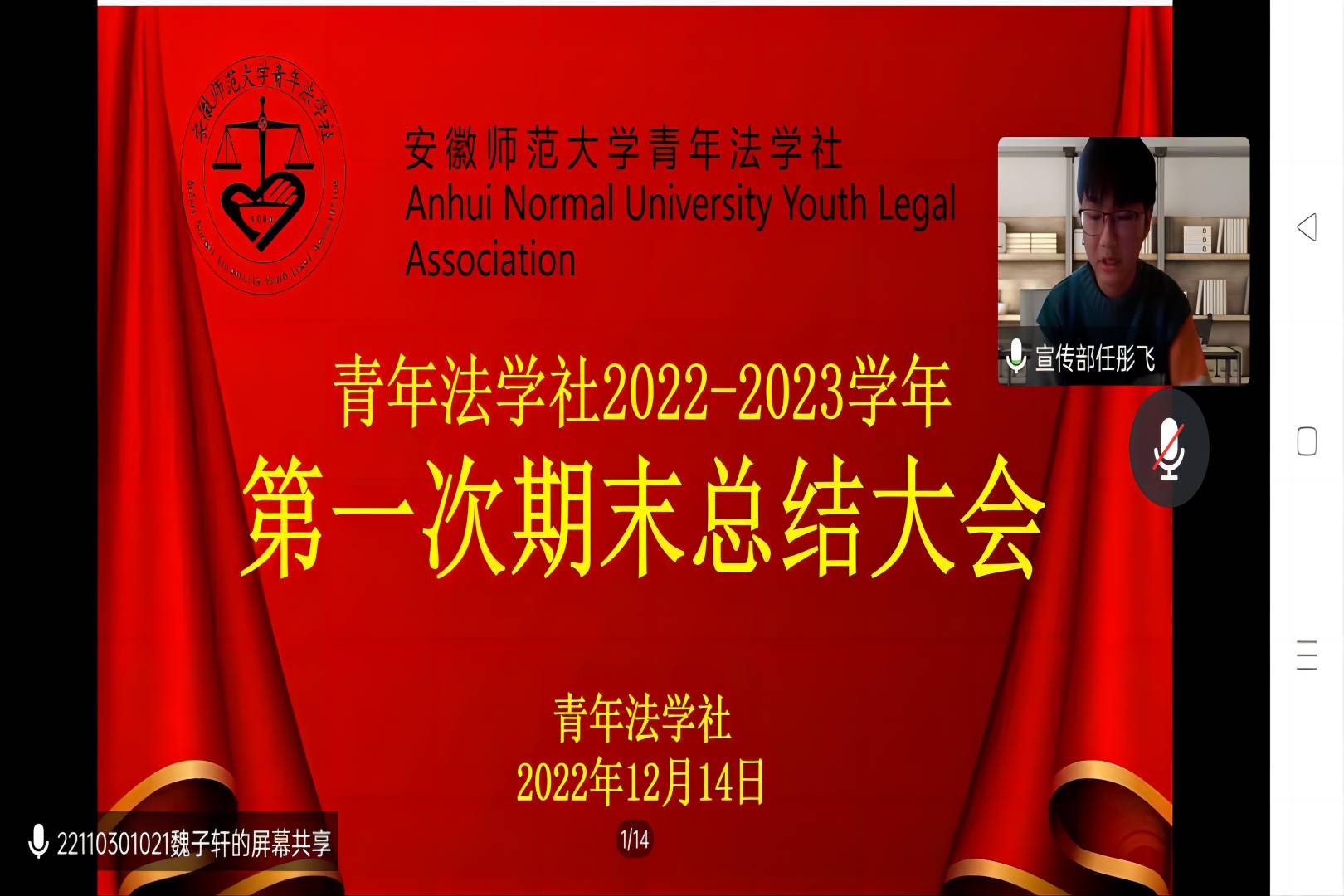 本网讯(青年法学社 葛毅)12月14日下午,受疫情员工返乡的影响,青年法学社通过线上腾讯会议视频连线的方式召开了青年法学社2022-2023学年第一次期末总结大会。青年法学社副会长蔡晓桐,各部门部长及工作人员出席本次会议,大会由活动部工作人员魏子轩主持。