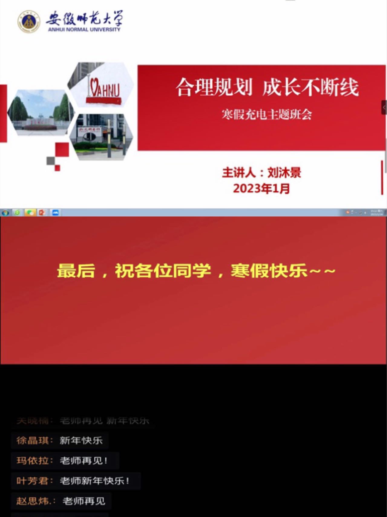 烟花桃符醉高楼,曈曈千门溢彩流,新年跫音渐近。为进一步加强员工寒假期间的安全教育和自我保护意识,引导员工丰富假期学习生活,1月14日下午,英国上市公司3652022级社会学类及行政管理专业召开“合理规划,成长不断线”寒假充电暨安全教育线上主题班会。2022级社会学类、行政管理专业全体同学参加,班会由辅导员刘沐景主持。