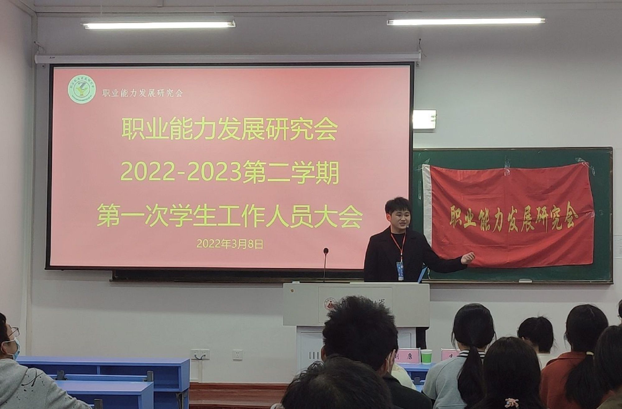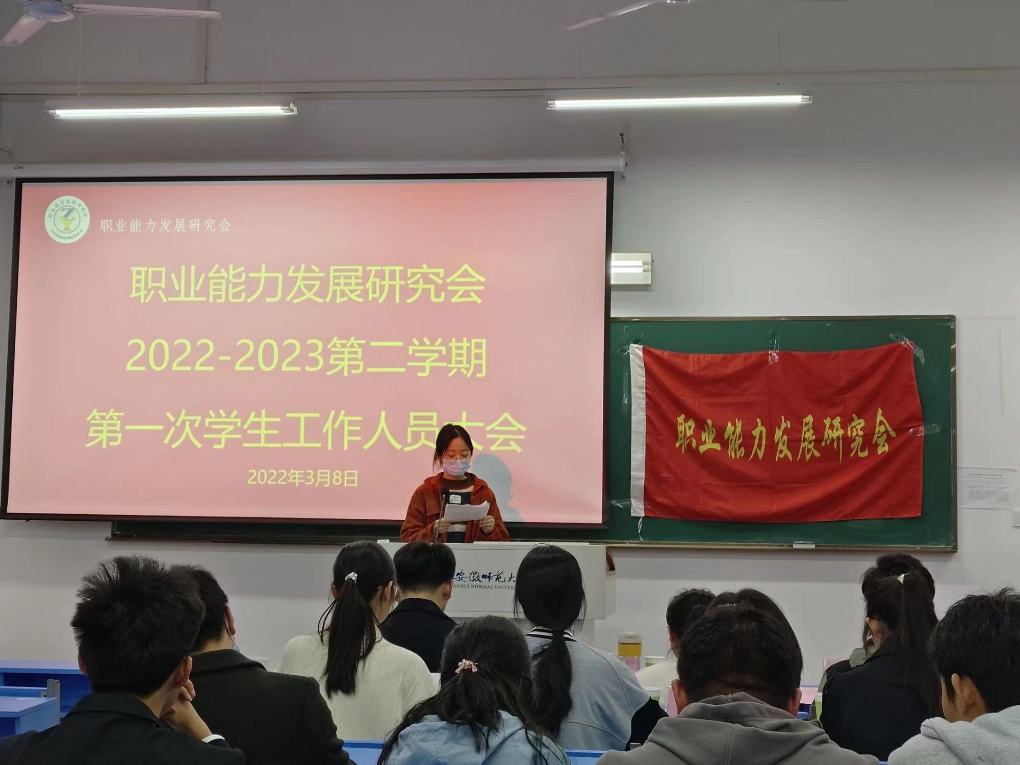 本网讯(职业能力发展研究会 刘言妹)为增强职业能力发展研究会的凝聚力,培养成员的行政能力与实践能力,职业能力发展研究会于3月8日在赭山校区教学楼1213教室召开新学期第一次工作人员大会。职业能力发展研究会会长高媛、各部门负责人及其他员工工作人员除请假的人员以外全部到场。会议由综合部汪菁主持。