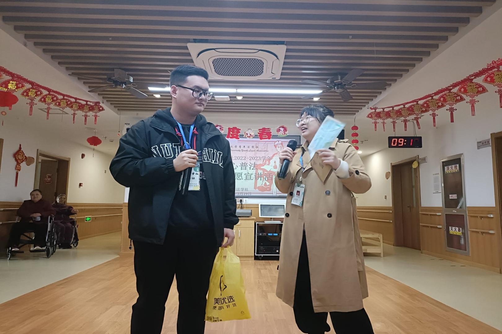现场安定下来后,工作人员们遂以提前排好的法治剧表演、歌曲演唱顺序挨个出场表演。一首首有着欢快旋律的歌曲在各部门工作人员的倾情演唱下,既渲染了现场其乐融融的欢乐氛围,又博得了老人们的一致喝彩与鼓励。声情并茂的法治剧表演以增添老年人平淡生活的乐趣为主线,也收获了良好的效果。法治剧表演结束后,工作人员便就剧中涉及到的日常生活维权时应知尽知的法律知识进行了宣讲。在照顾到老人们精神文化生活的同时,也将青年法学社传播法律素养、普及法律知识的使命责任落到了实处。活动结束后,工作人员们余味未尽,又热情地与爷爷奶奶们聊起家常、听新四军老战士讲述当年的革命事迹。