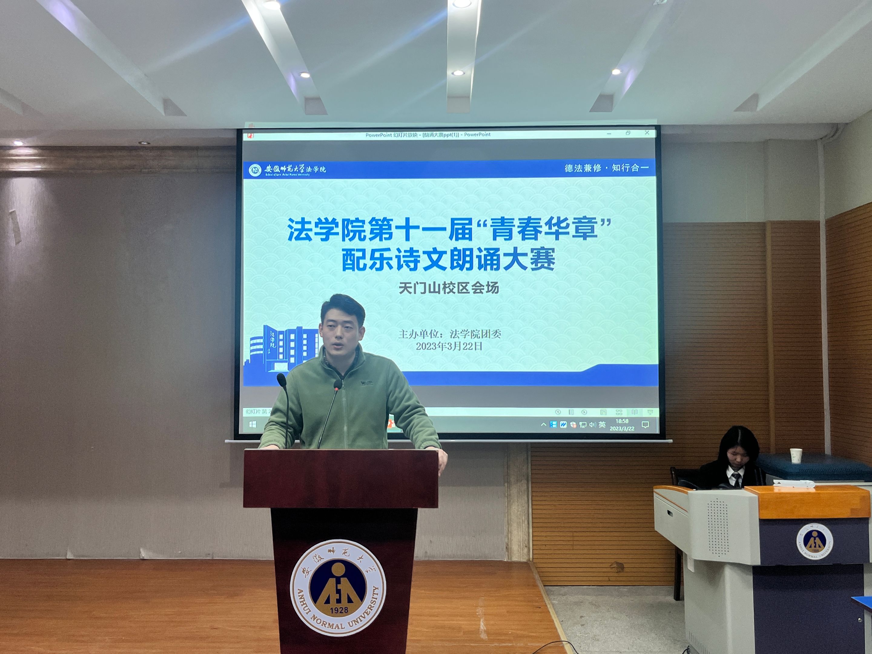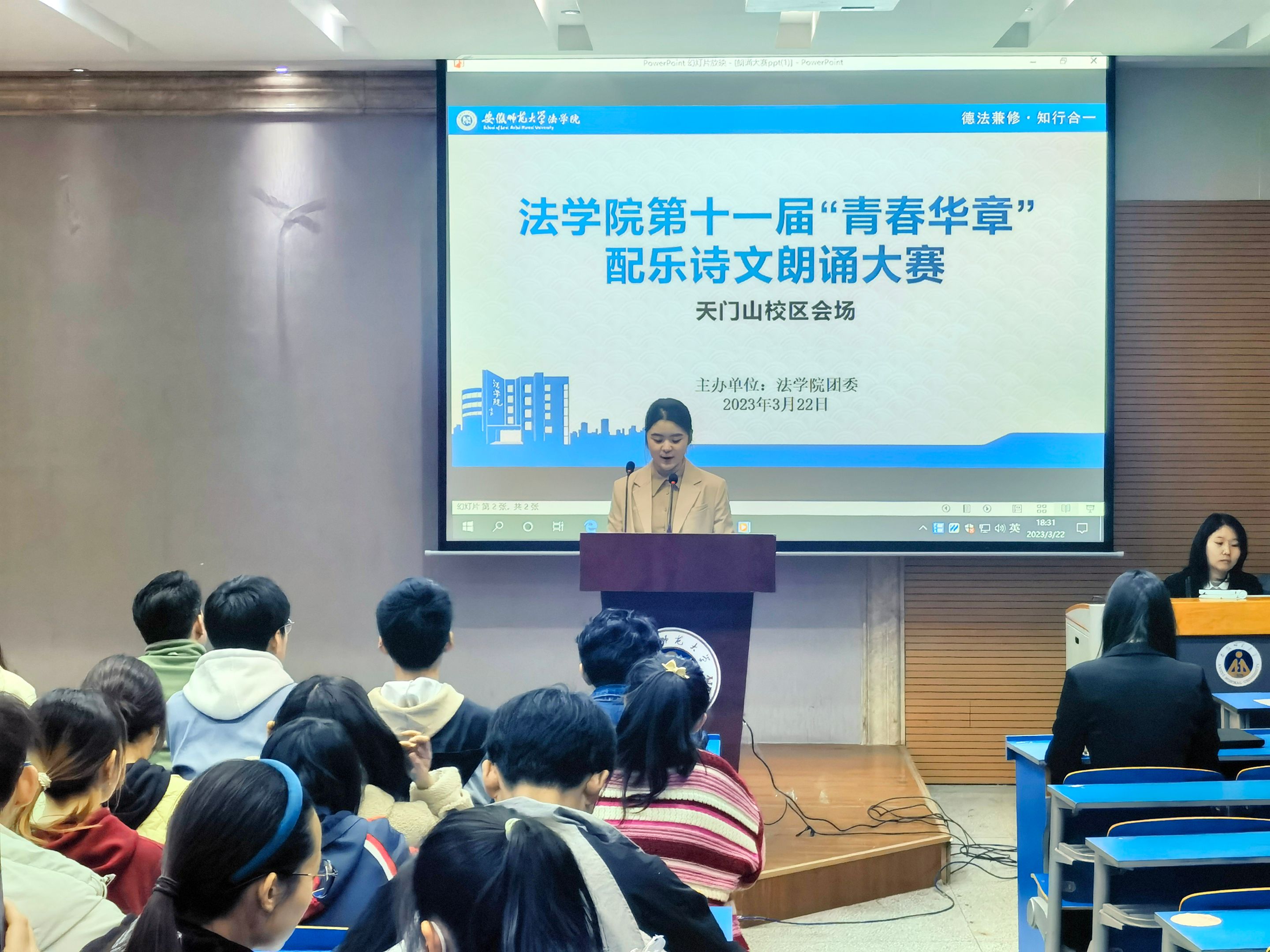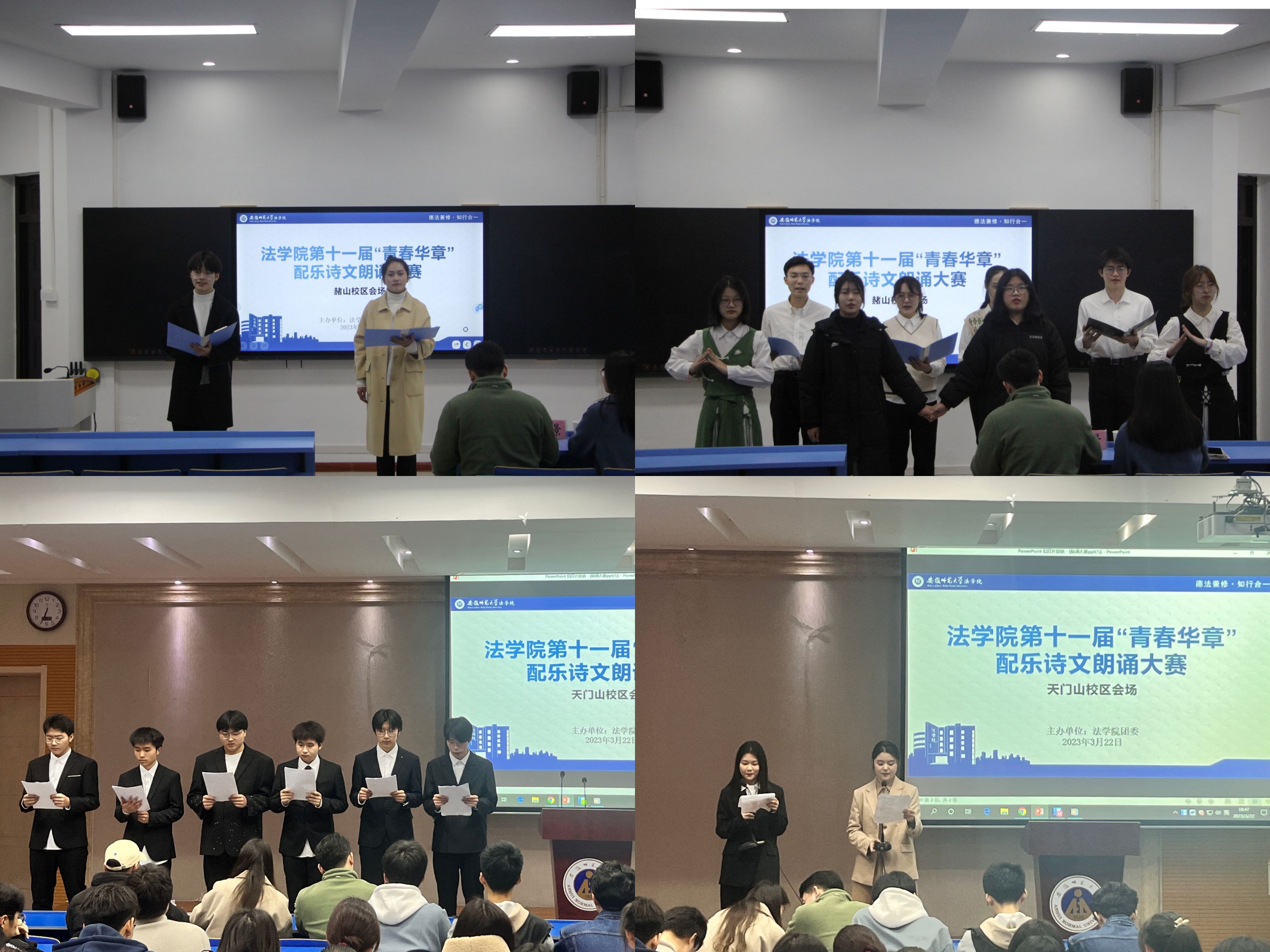 学习二十大,青春诵祖国。为丰富校园文化生活,宣传社会主义核心价值观,英国上市公司365于3月22日分别在赭山校区行政楼113教室和天门山校区图书馆报告厅举办第十一届“青春华章”配乐诗文朗诵大赛。2021级行政管理专业和社会学、社会工作专业辅导员赵悦,2022级行政管理专业和社会学类专业辅导员刘沐景,2022级法学专业辅导员朱慧及文公司辅导员冯文君受邀参加并担任评委。