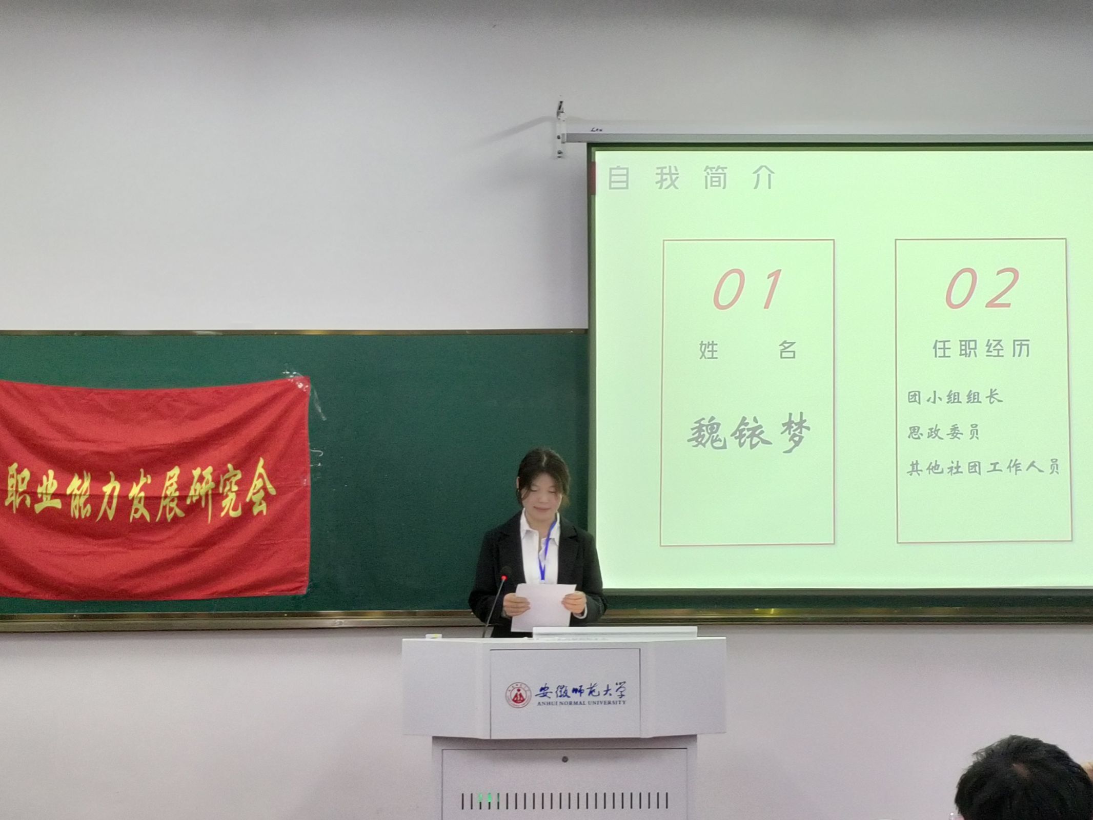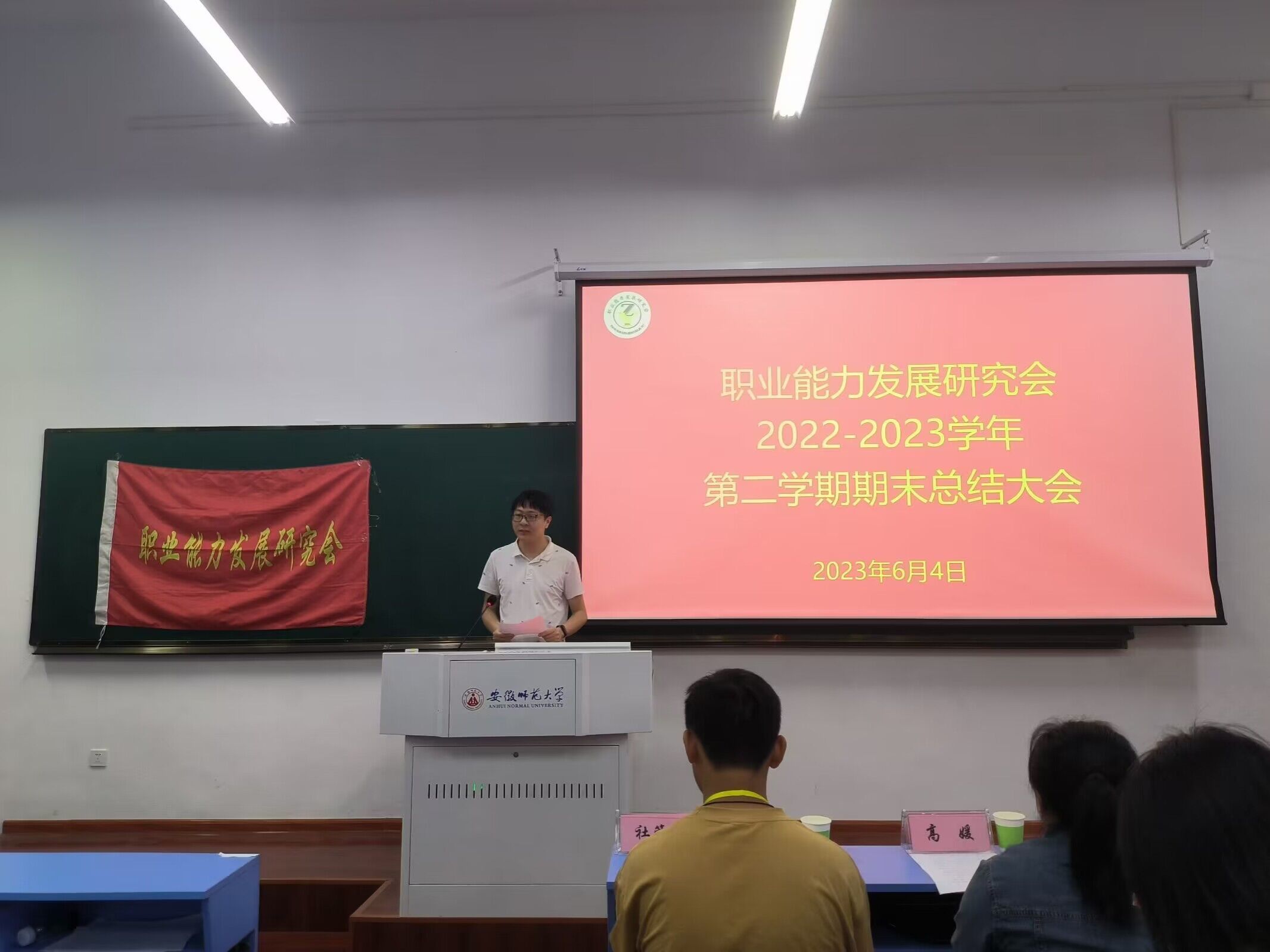 本网讯(职业能力发展研究会 武剑豪)6月4日,职业能力发展研究会在赭山校区教学楼1108教室举办2022-2023学年第二学期期末总结大会暨十佳工作人员竞选。职业能力发展研究会会长高媛、各部门负责人及其他员工工作人员参与了此次大会。会议由综合部工作人员胡世坤主持。