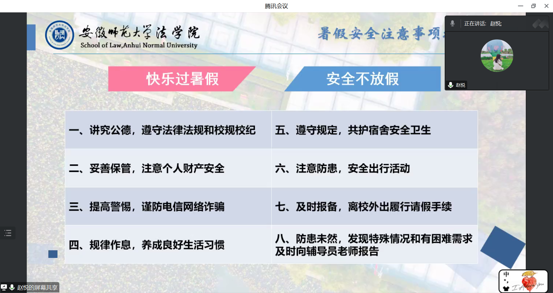 班会最后,赵悦为班级同学详细解读公司近期发布的暑假员工安全注意事项的通知。赵悦强调在校期间或外出实践活动当中都要注重保护个人人身财产安全,注意防范电信诈骗等,发现特殊情况和有困难需求及时向辅导员老师报告,同时规律作息,养成良好生活习惯。
