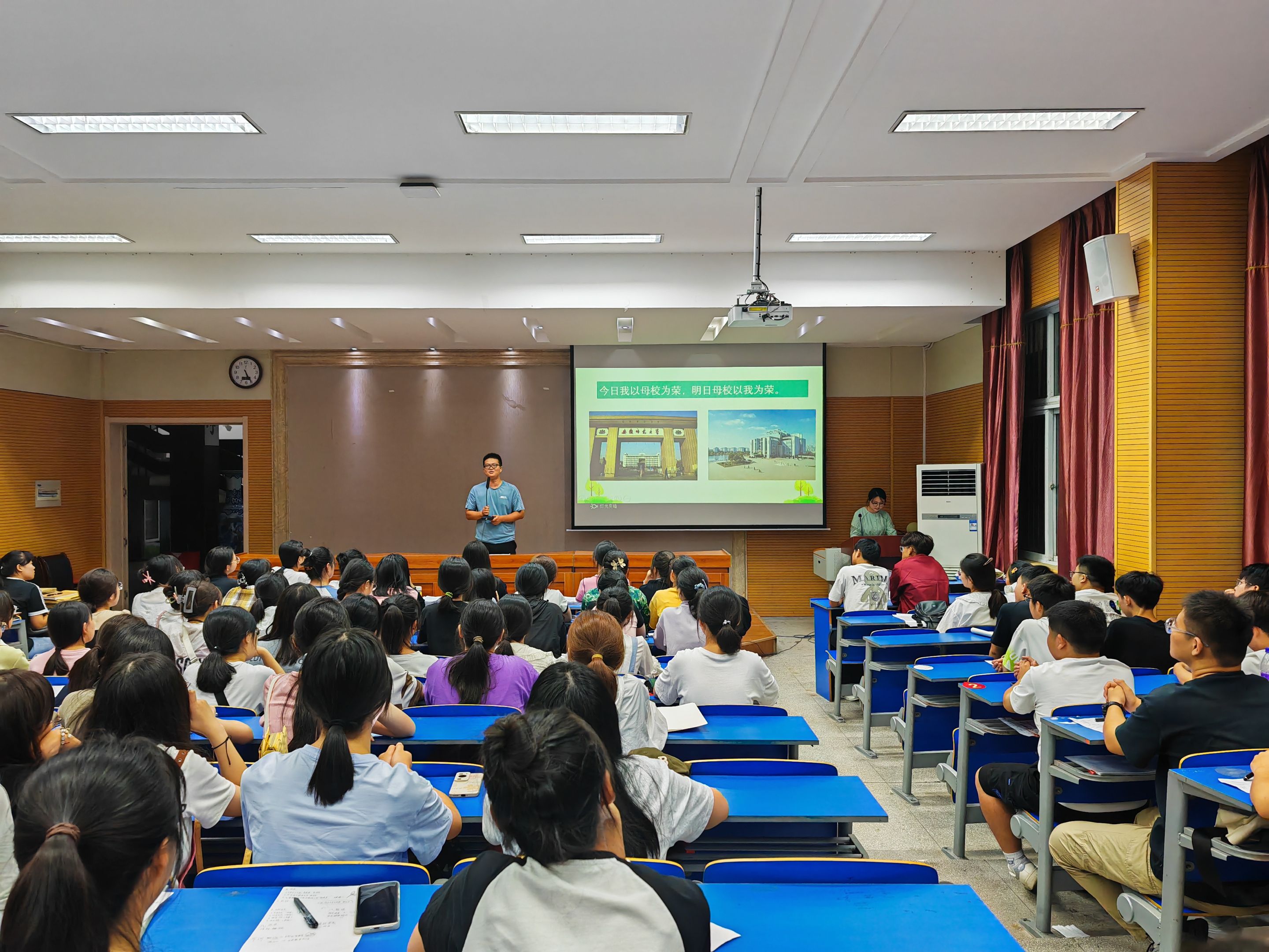 法学学长参与课堂,朋辈教育指点迷津。会议后程,李晨冉邀请了2023届安徽省优秀毕业生许辰学长为新生做经验分享。学长运用诙谐幽默的谈吐,结合自身经历设身处地给予新生建议,以“十四个问题”贯穿发言,既有效解答了新生初到师大的众多疑惑,又为新生指明了专业课学习的大方向。