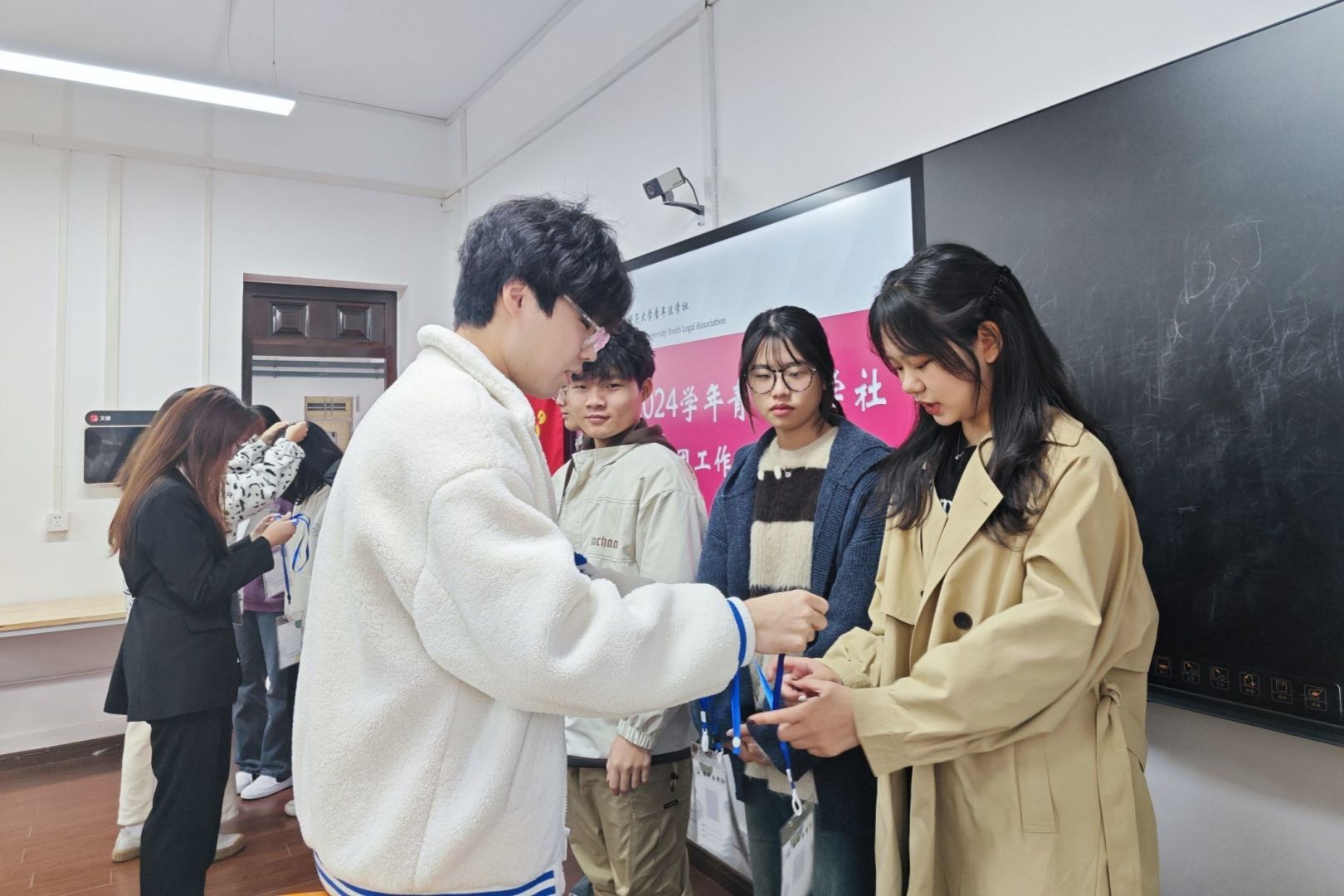会议伊始,青年法学社各部门新任社团工作人员代表相继上台发言,分享自己加入青年法学社的喜悦之情,并表达了对部门工作的畅想和热情,阐述了进入青年法学社的责任与担当。与会期间,各部门部长相继发言分享自己的工作经验和收获,鼓励新成员以更加饱满的姿态投入到社团工作中去,并希望能够看到他们在工作中的成长。紧接着各部门部长为新任社团工作人员发放工作证并合影留念。最后,会长王凤艳总结与会内容,提出工作要求与期待。她表示新任社团工作人员们的充足热情,体现了青年法学社的强大向心力,并从思想认知和工作要求两方面对新任社团工作人员们表达了殷切期望,希望大家都能够适应工作节奏,坚持付出、服务他人,在各部门努力下建设更好的青年法学社。