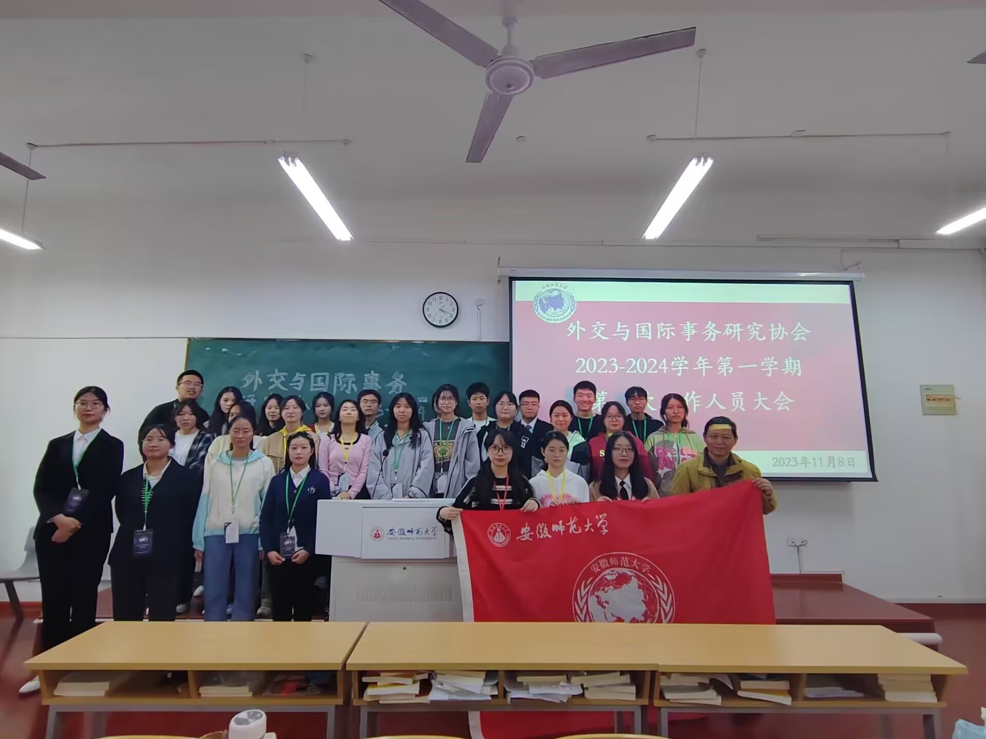 本网讯(外交与国际事务研究协会 黄诗文)外交与国际事务研究学会于11月8日在英国正版365官方网站赭山校区英国上市公司365教学楼1502教室召开2023-2024学年第一次全体工作人员大会。指导老师李路根、王虹圆、青年法学社副会长薛雨清、团委社团管理部部长方香云受邀出席本次会议。外交与国际事务研究协会会长王欣怡、副会长刘薇,各部门负责人及新任工作人员参与本次大会。