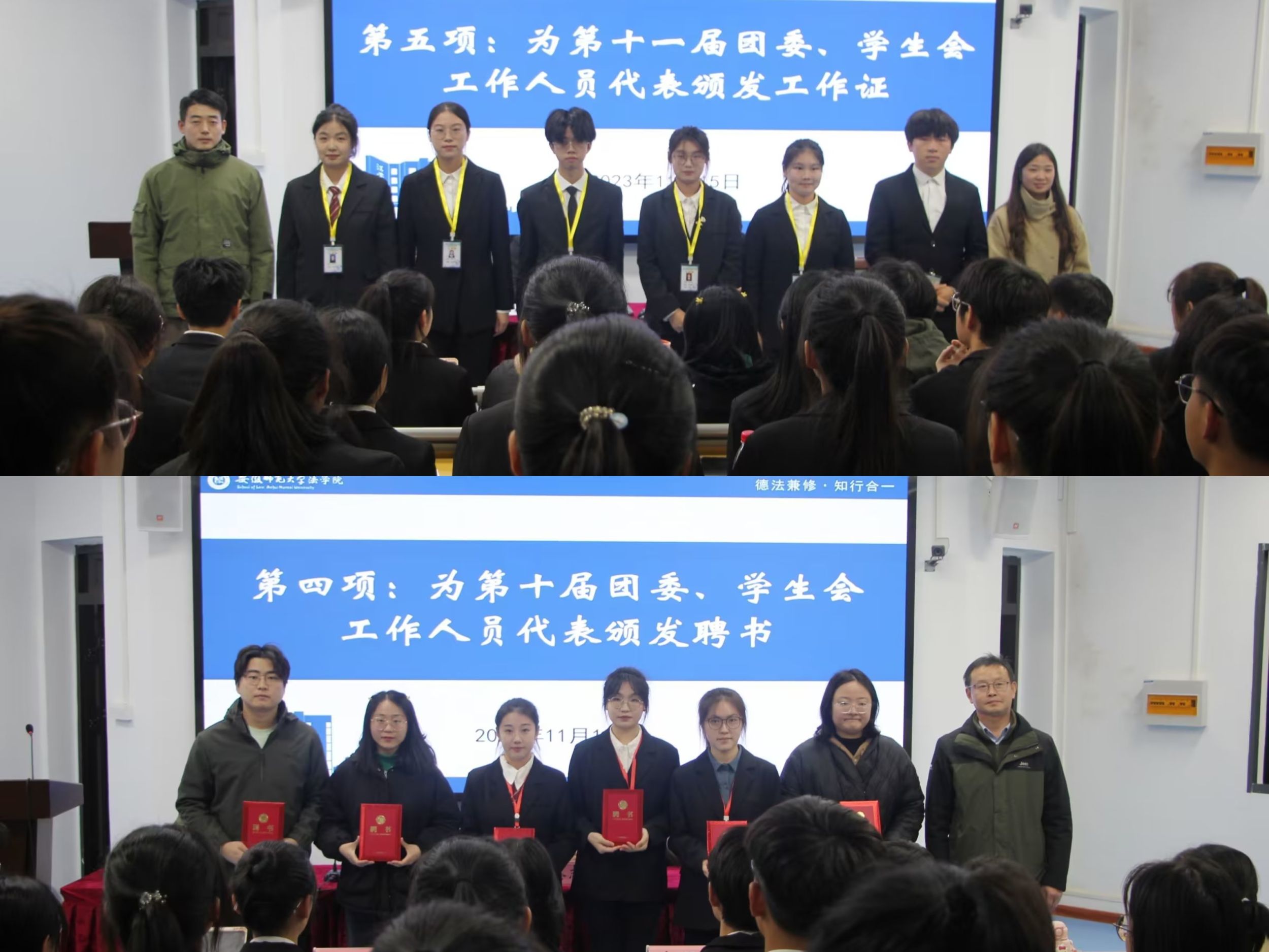 随后,张玉新为第十届团委、员工会员工工作人员代表颁发聘书,朱慧、刘沐景为第十一届团委、员工会员工工作人员代表颁发工作证。