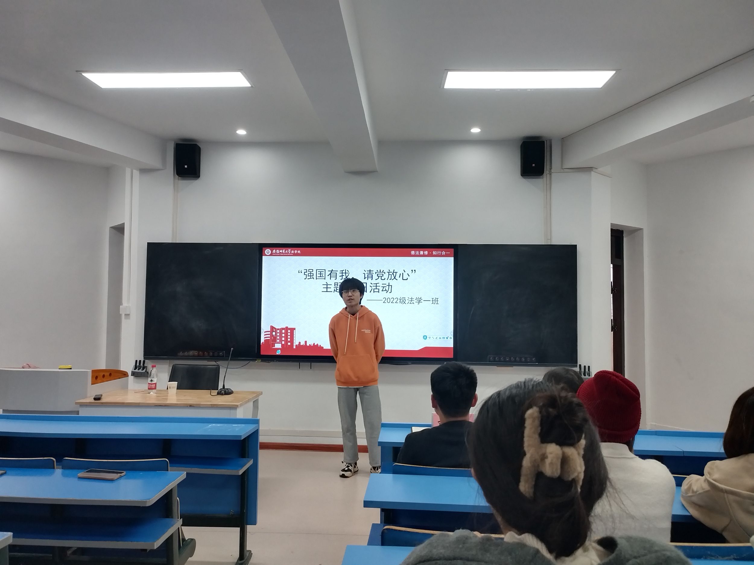 团支书赖嘉怡在会上进一步为同学们讲述了“中国式现代化”的深刻内涵,她分别介绍了中国式现代化的探索历程、中国式现代化的特点以及全面建成社会主义现代化强国战略安排,由深入浅地向同学们展示“强国有我,请党放心”的主题内容。